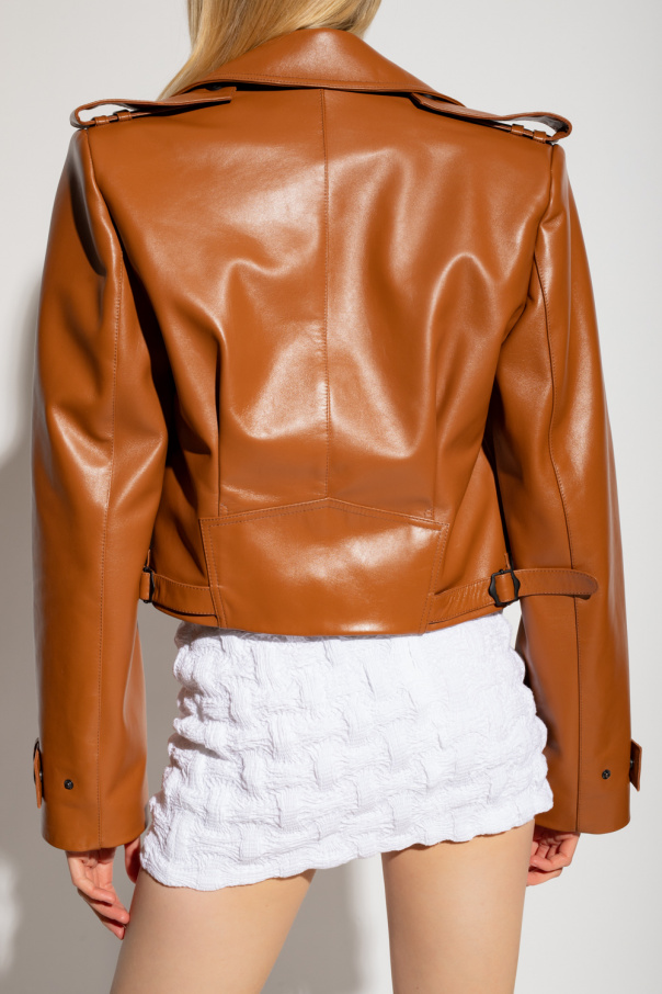 Brown ‘Avignon’ double-breasted cropped jacket from The Mannei. Made of leather, this garment features snap fastenings, notch lapels, oversized snap-fastened epaulettes, long sleeves with snap-fastened cuffs and an adjustable buckle belt at the hem.