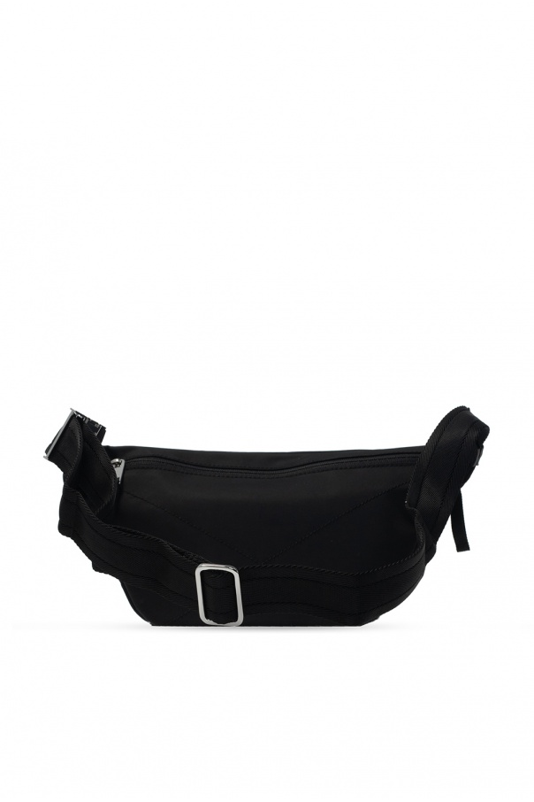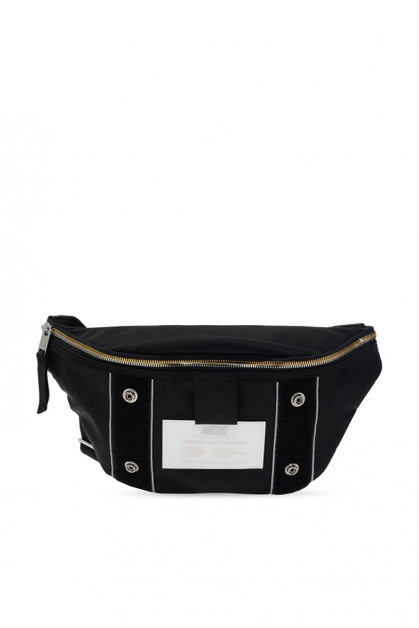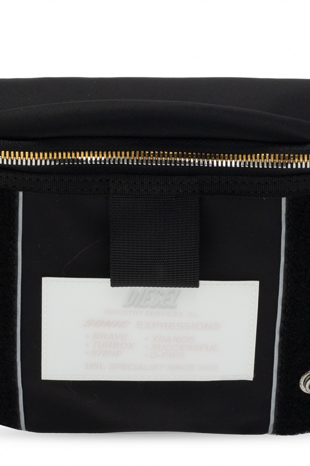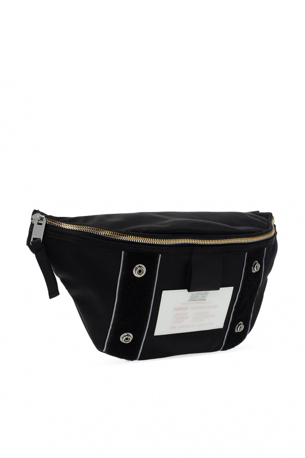 Black belt bag from Diesel. Showcasing a stitched white logo appliqué and exposed seams, this design fastens via a zip and employs an adjustable waist belt, an external zip pocket on the back, a silver-tone and gold-tone metal hardware and an orange clad interior with one compartment and one zipped pocket.