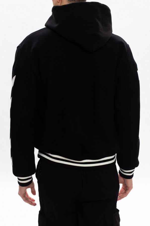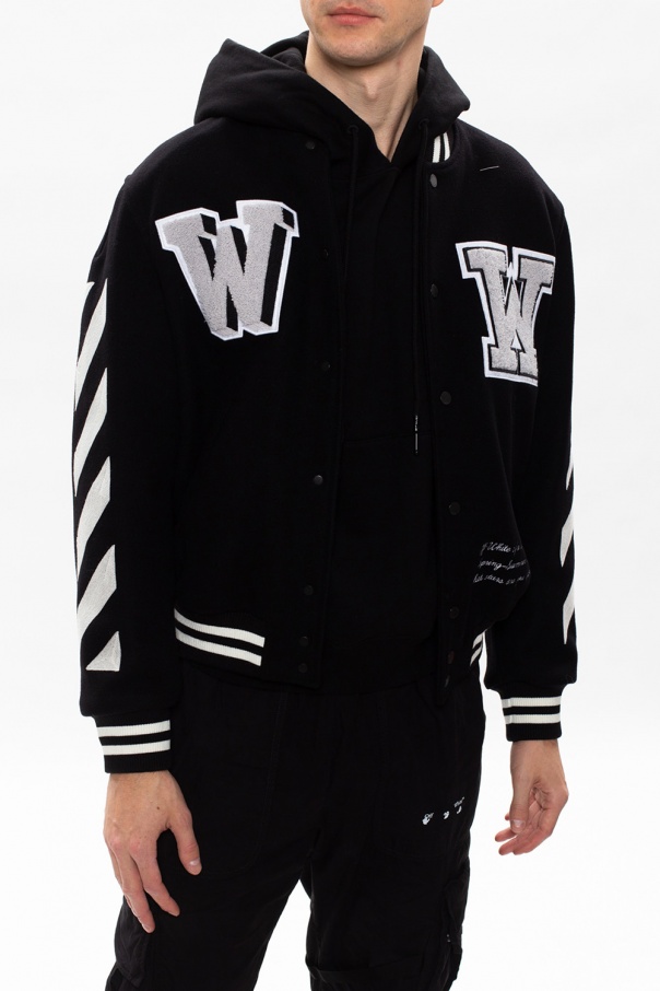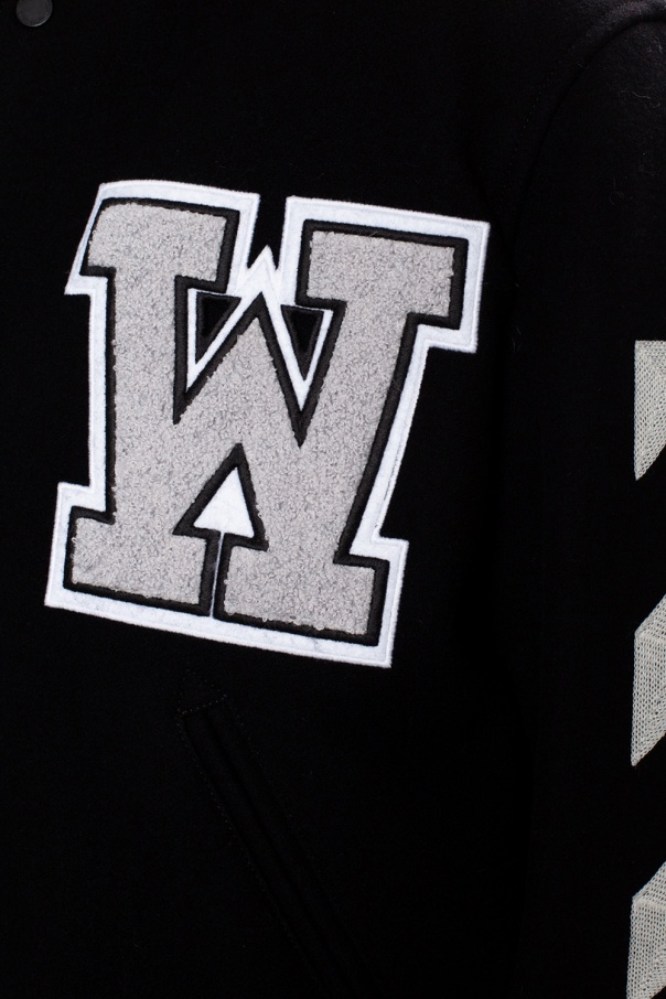 Black bomber jacket from Off-White. Boasting the brand's signature white diagonal stripes on the sleeves, this wool-crafted design fastens via snap-buttons and employs two welt side pockets and white and black rib-knit trims at the collar, bottom hem and cuffs.