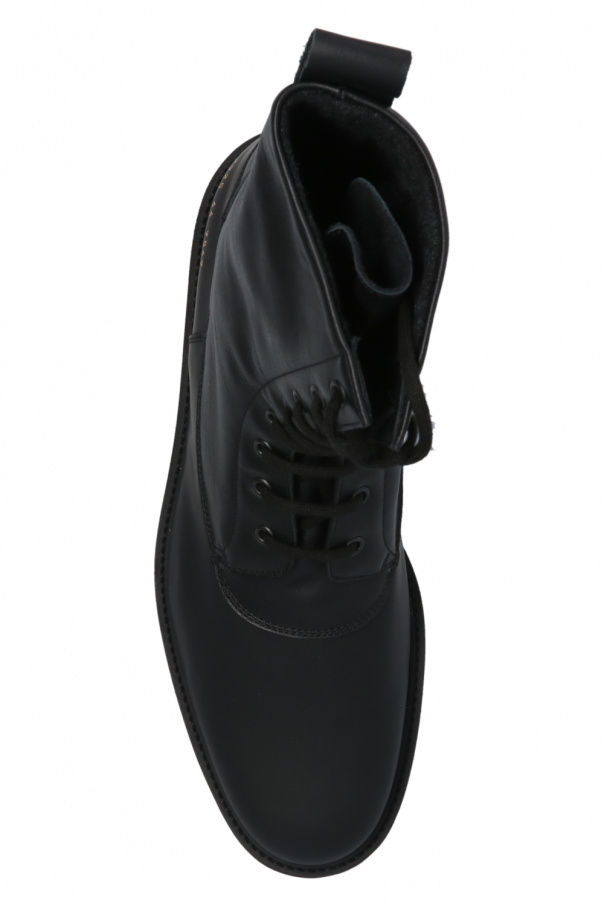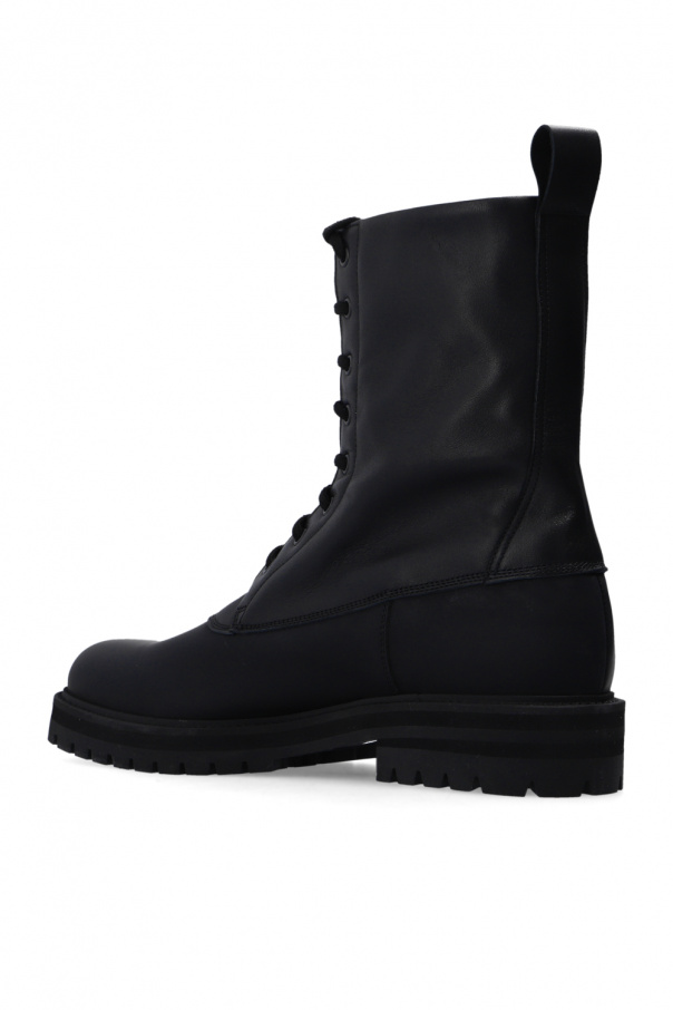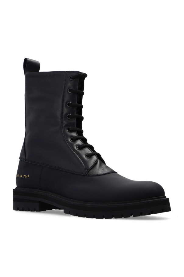 Black ‘Technical’ boots from Common Projects. Crafted from leather, this lace-up model sits on a rubber sole and showcases a gold-tone graphic print on the side and swappable shoelaces.