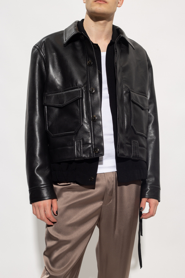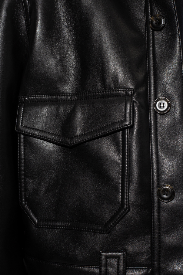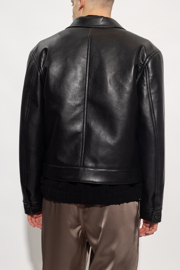 Black ‘Ruben’ jacket with collar from Nanushka. Crafted from regenerated leather, which helps reduce textile waste, this model features buttons with a concealed placket, two flap pockets and long sleeves with button cuffs.