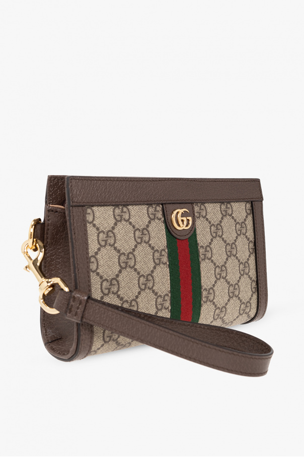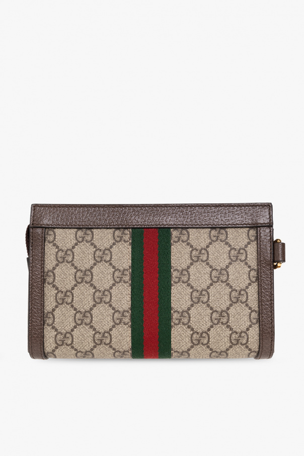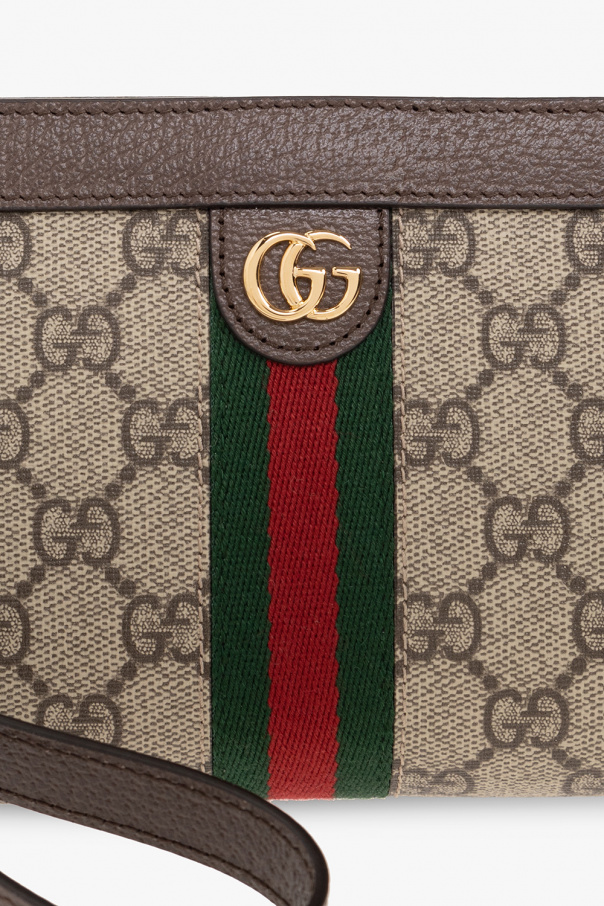 Beige and brown ‘Ophidia’ handbag from Gucci. Made of GG Supreme canvas with leather trims, this model fastens with a zip and is decorated with the brand’s signature green and red Web stripe and metal logo. It has a detachable wrist strap on the side, gold-tone metal hardware and one internal compartment with a detachable carabiner hook and two card slots.