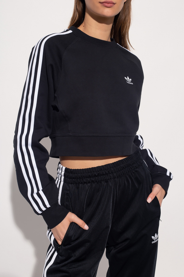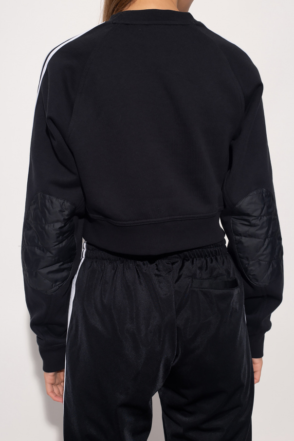 Black crewneck sweatshirt from ADIDAS Originals. Made of cotton, this garment features a white logo embroidery, the iconic three stripes, quilted elbow patches and ribbed trims at the neck, hem and cuffs.