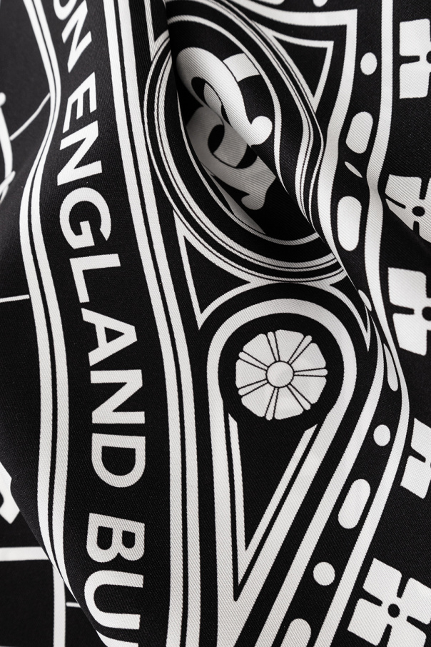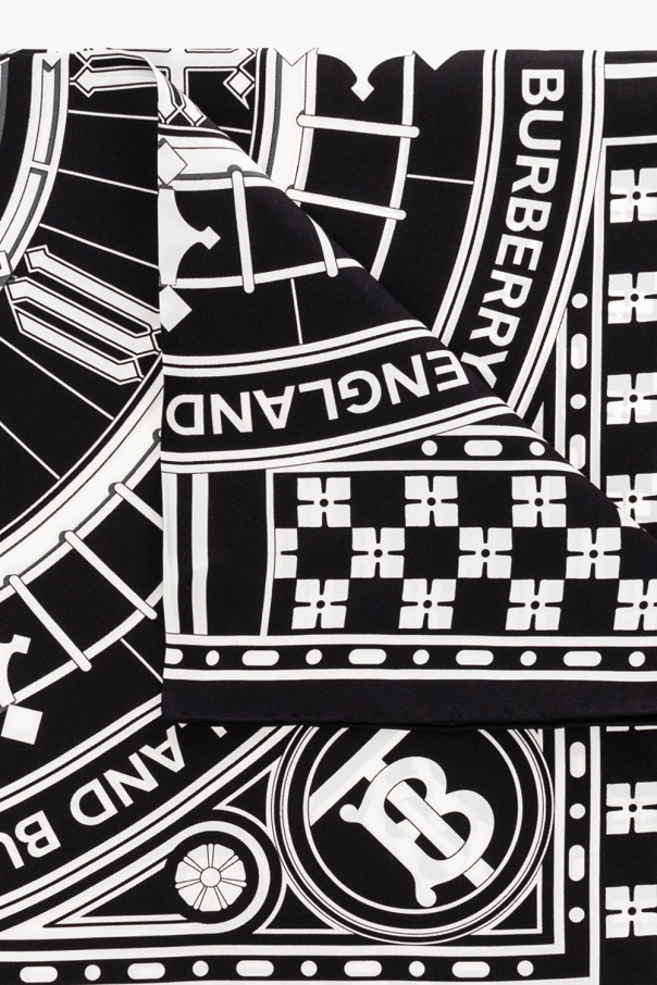 Black and white shawl from Burberry. Made of silk, this item showcases a decorative graphic print and logo.