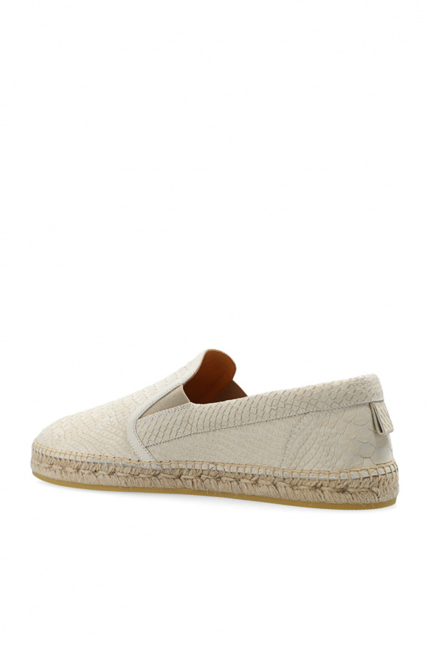 Light beige ‘Vlad’ espadrilles from Jimmy Choo. Made of leather with a snakeskin effect, this pair features elastic side panels, logo patch and decorative sole with woven jute in beige and rubber trims.