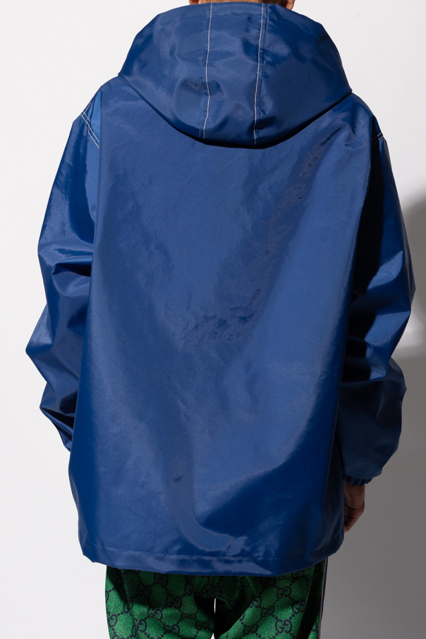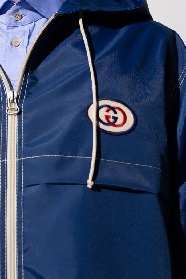 Navy blue jacket from Gucci. Enriched by contrasting white stitching and a white, blue and red logo patch, this style features a two-way zip fastening, two zipped pockets, elasticated cuffs and a drawcord-adjustable hood and hem.