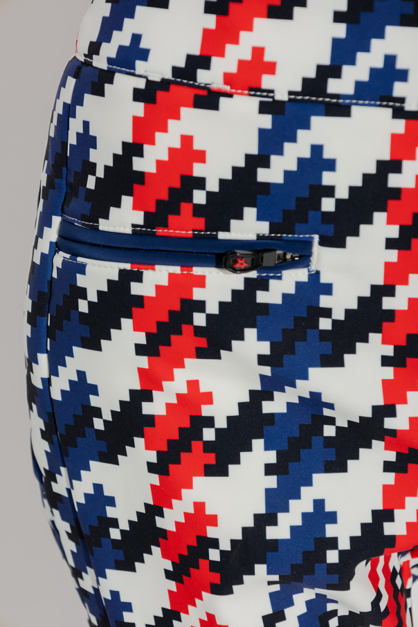 Multicolored ‘Aurora’ ski trousers from Perfect Moment. Made of breathable Toray Dermizax™ stretch-shell, which protects against moisture and cold temperatures, this fitted design is complete with a zip, hook and snap button fastenings, the brand’s signature houndstooth pattern, incorporated knee pads and two-layered, flared legs – zipped outer layer and elasticated fleece lining with snap fastenings.