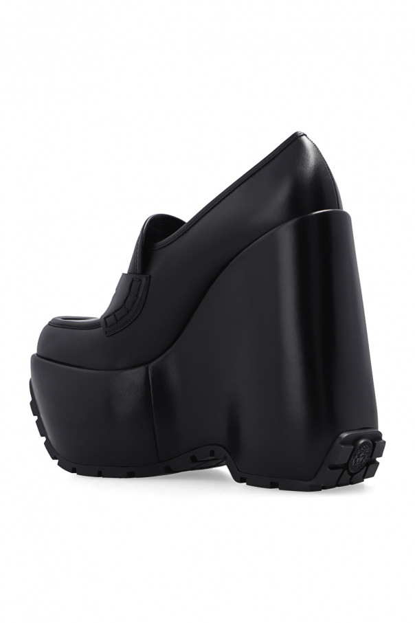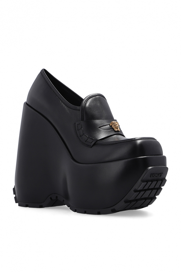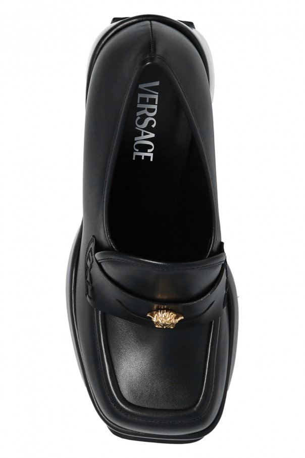 Black ‘Triplatform’ loafers from Versace. Made of calf leather, this model sits on a black rubber sole and showcases the brand's signature Medusa hardware on the front.