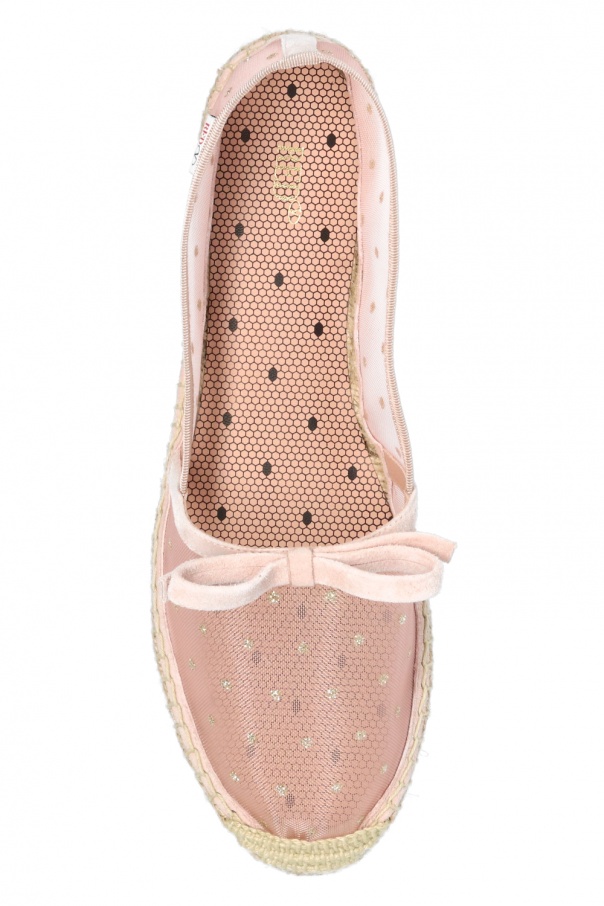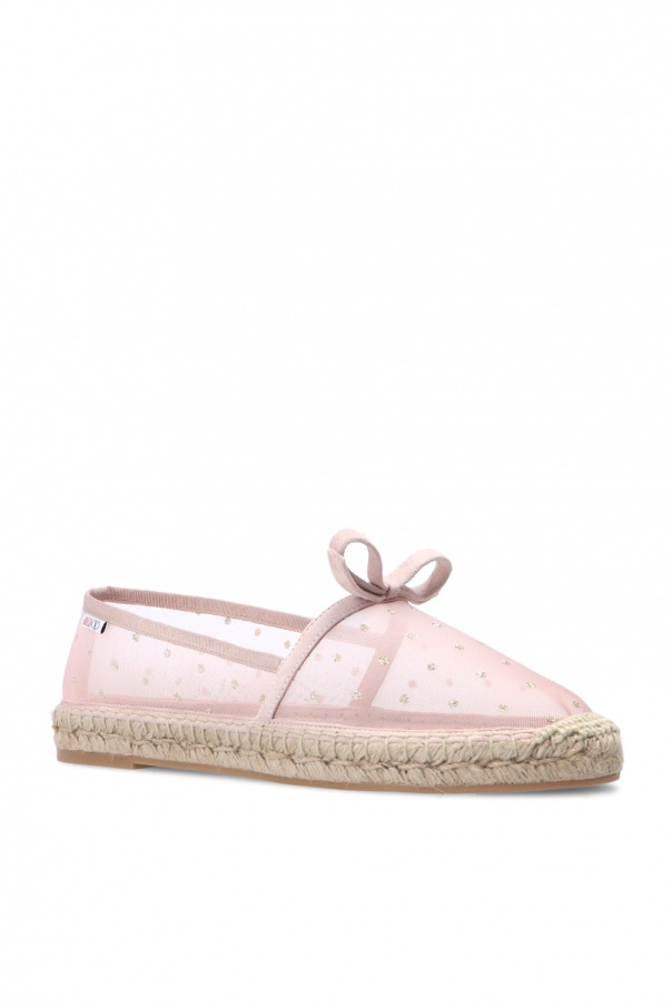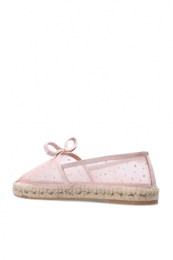 Blush pink transparent espadrilles from Red Valentino. Enriched with a gold-tone graphic print and a decorative bow, this suede-trimmed pair sits on a beige rubber sole.