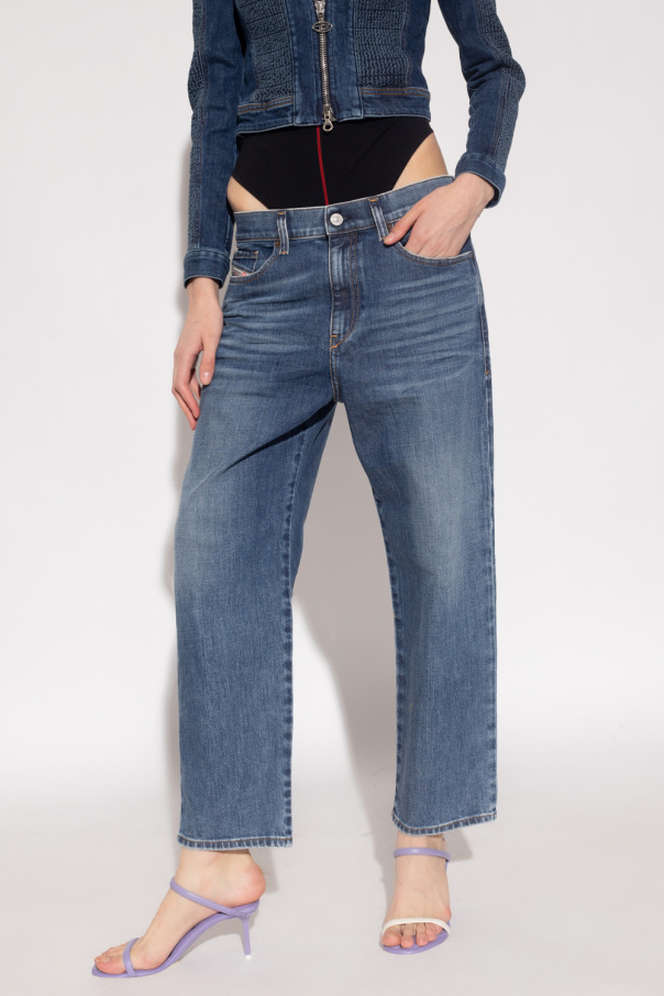Blue ‘2016 D-Air’ boyfriend jeans from Diesel. Made of cotton from sustainable farms, this pair features a zip and button closure, red anagram embroidery at the back, five slip pockets, dropped crotch and straight legs.