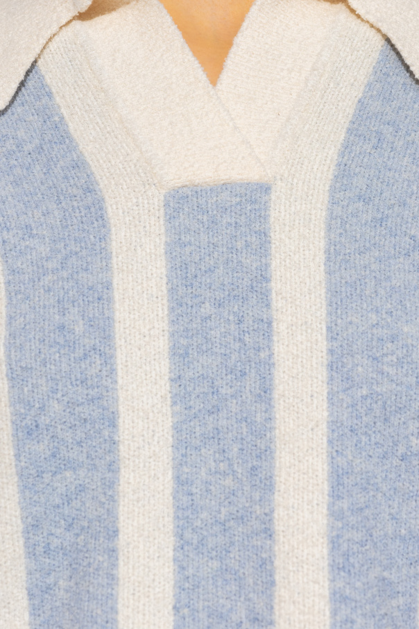 Cream and blue knitted polo shirt from Jacquemus. Embellished with all-over vertical stripes, this style features a slim-fitting silhouette with a denuded back with ties, and short sleeves.