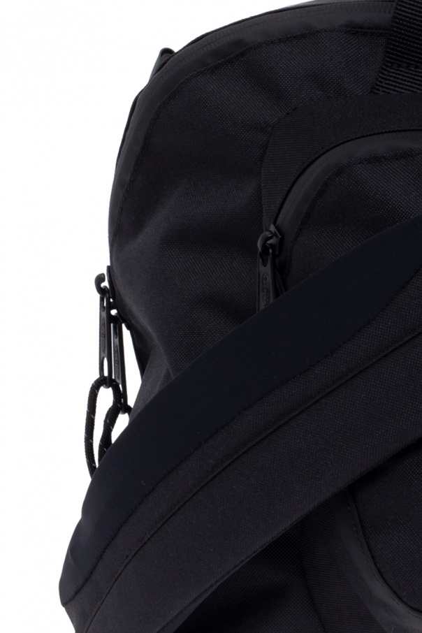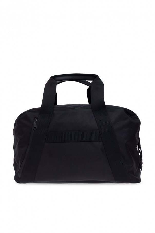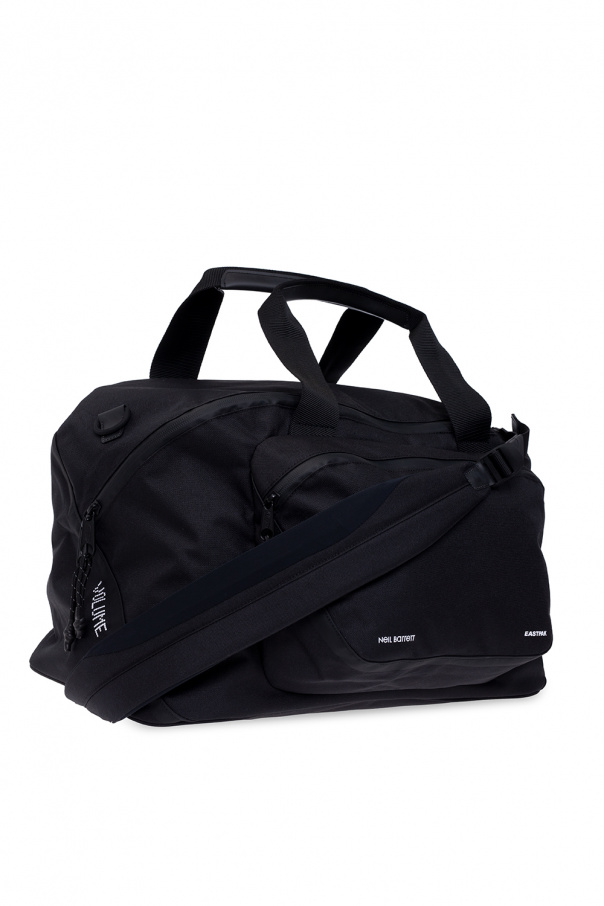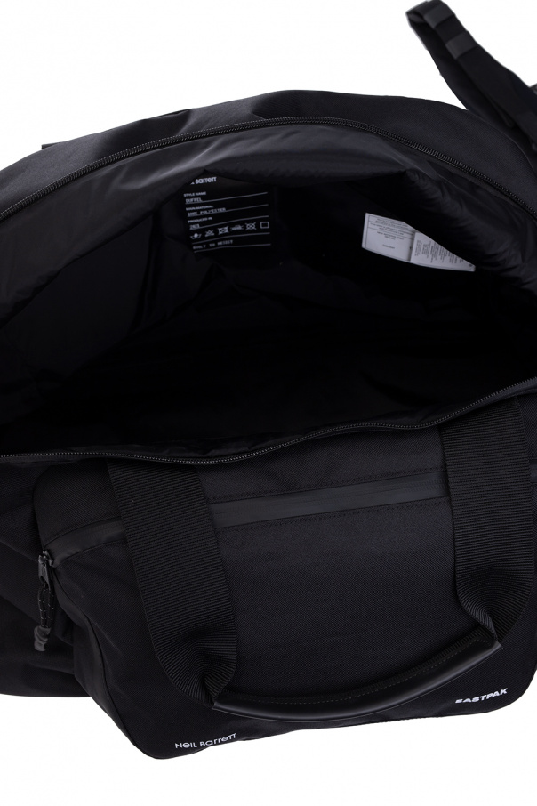 Black duffel bag from Neil Barrett x EASTPAK. Embellished with a white logo pattern, this design features a zip fastening, two half-round handles, a zip front pocket, a shoulder strap, black metal hardware and one internal compartment with a zip pocket.