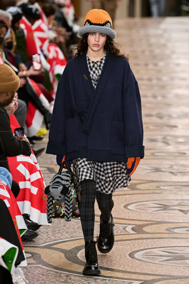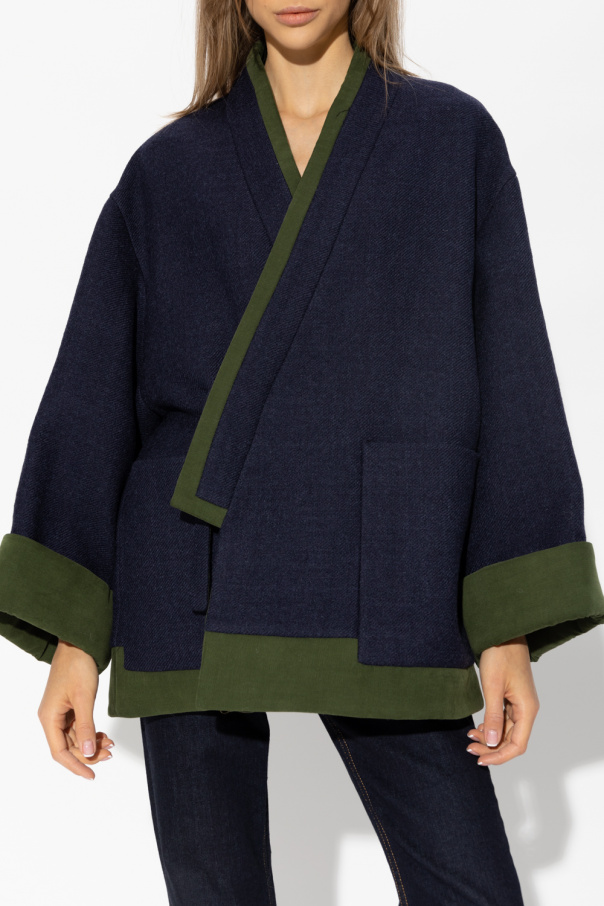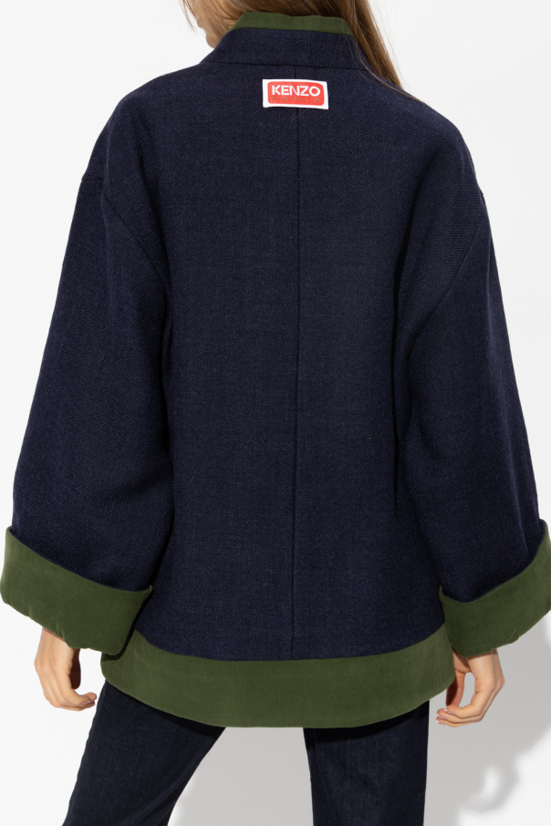Navy kimono cut coat from Kenzo. Made of wool, this garment features tie fastenings, red and white logo patch, two slip pockets and long sleeves with folded cuffs.
