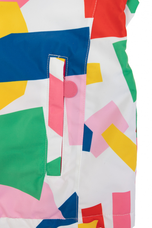 White ski jacket from Stella McCartney Kids. Fastened with a zip, this garment is complete with a geometric print, side zips, two front pockets, one sleeve pocket, long sleeves with black elasticated cuffs and black fleece lining.
