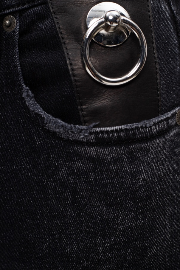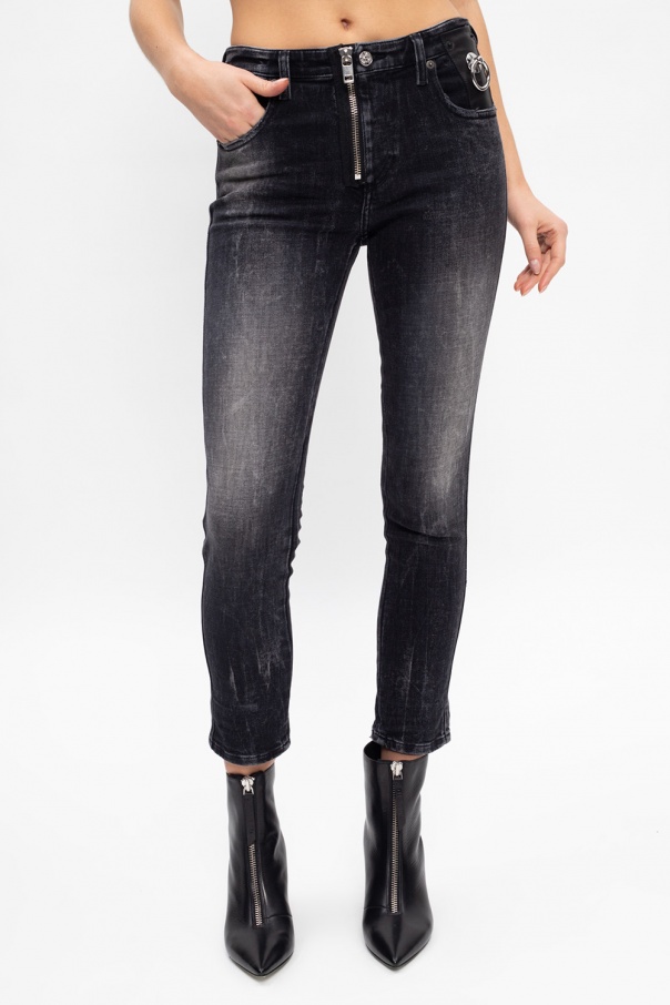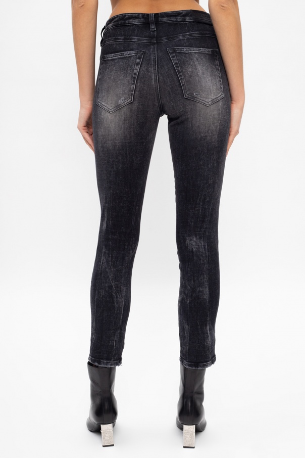 Grey 'Babhila' jeans from Diesel. Crafted from stretchy cotton denim with distressed effects, this pair falls down with tapered legs and employs zip and button closures, classic five pockets, a silver-tone metal plaque and logo patches for the brand recognition.
