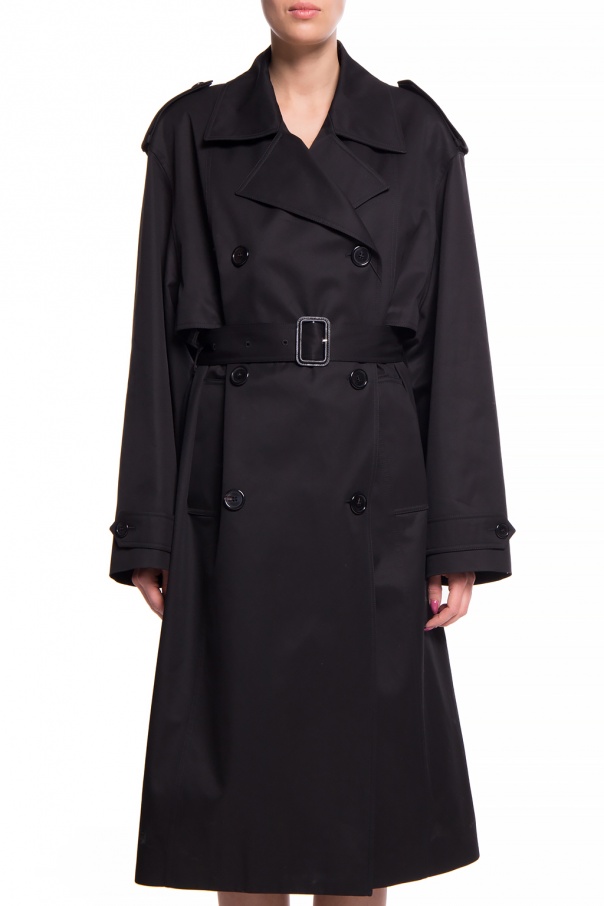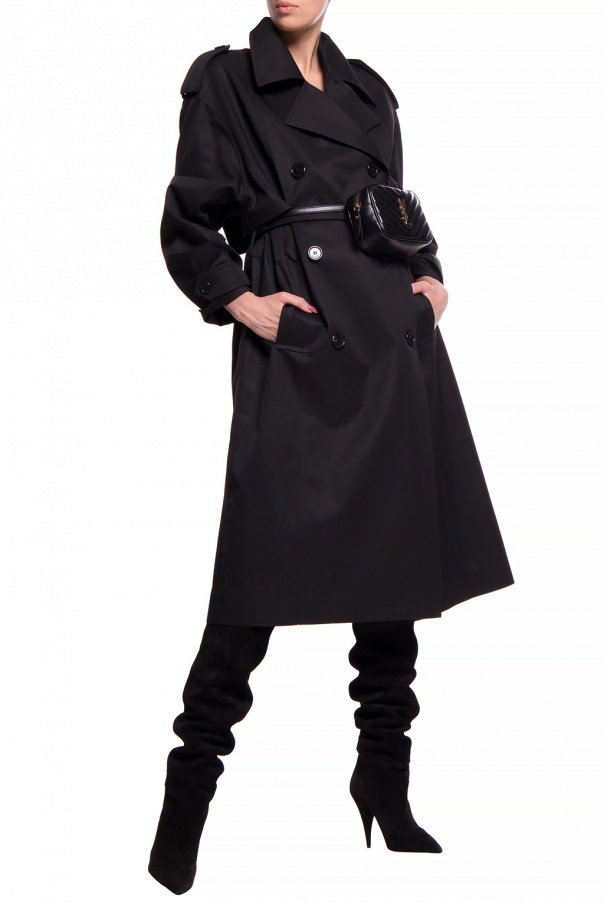 Black double-breasted trench coat from Saint Laurent. Fastened with buttons. Adjustable belt at the waist. Two slip pockets on the front. Single rear vent. Epaulettes on the shoulders. Silk lining.