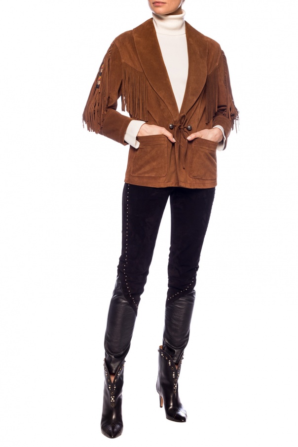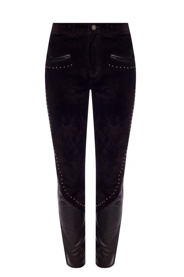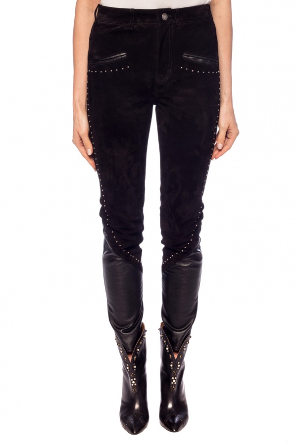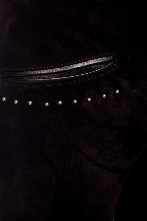 Black high-waisted trousers from Saint Laurent. Made of suede and leather. Fastened via zip and button. Encrusted with antiqued silver-tone studs. Feature 2 welt rear pockets.