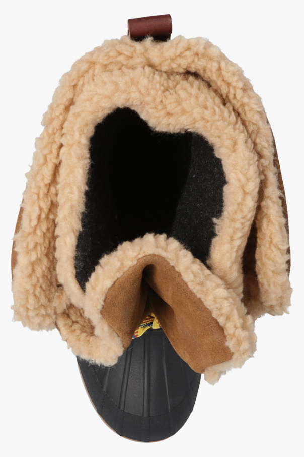 Brown and black ‘Wood Lover Duck’ lace-up snow boots from Dsquared2. Resting on a brown rubber sole, this lace-up pair features a leather, suede and rubber upper, faux fur lining and multicolored logo patches.