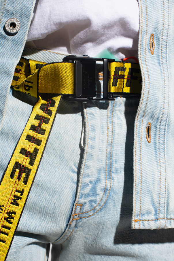 Light blue jeans from Off-White. Crafted from distressed cotton denim, this pair falls down with straight legs and features a zip fly with a button, five pockets, a black logo print, exposed orange stitching details and a brown logo patch.