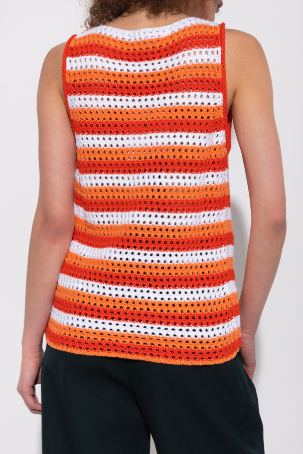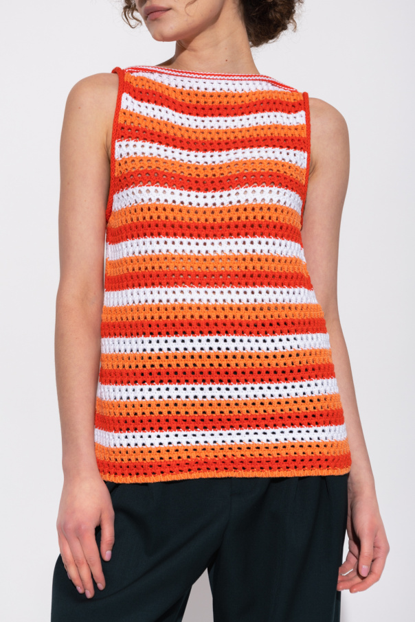 Orange, red and white crochet sleeveless top from Victoria Beckham. Crafted from a cotton blend, this style features a stripe pattern and a boat neck.
