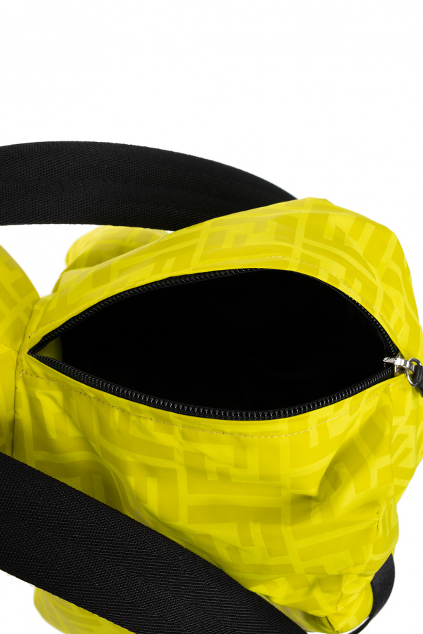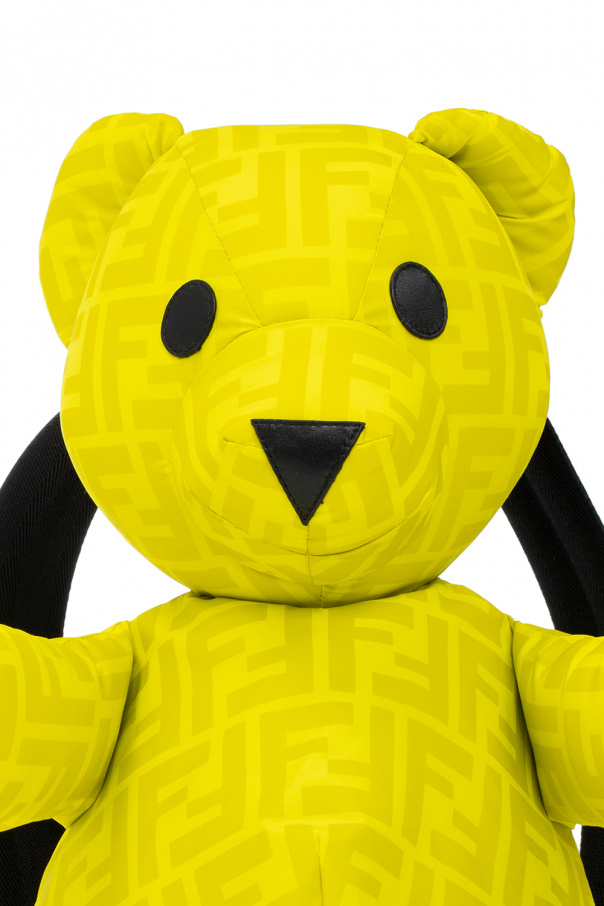 Yellowish-green and black Teddy bear-shaped backpack from Fendi Kids. Crafted from monogrammed fabric, this design features a zip fastening, a half-round handle, adjustable shoulder straps and one internal compartment.