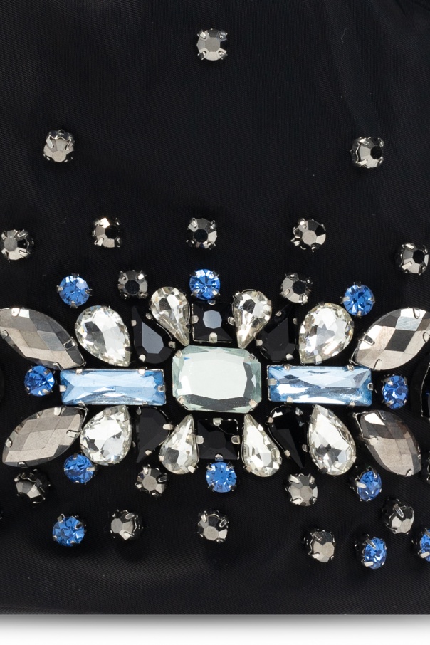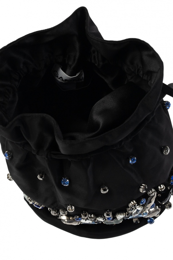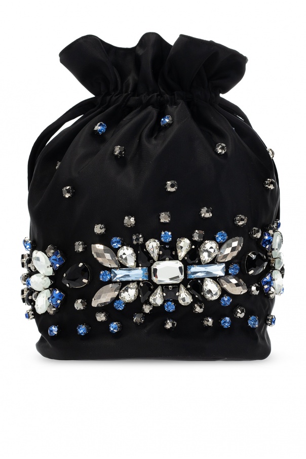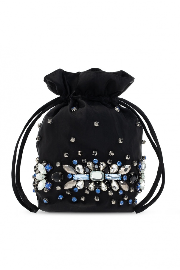 Black hand bag from Ganni. Embellished with a white, navy blue and grey crystal appliqué, this design is cinched with drawcords and outfitted with two wrist straps and interior with one compartment.