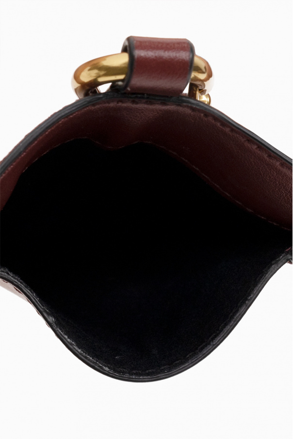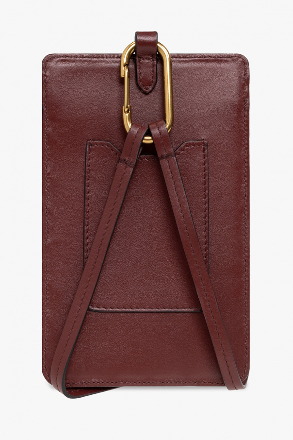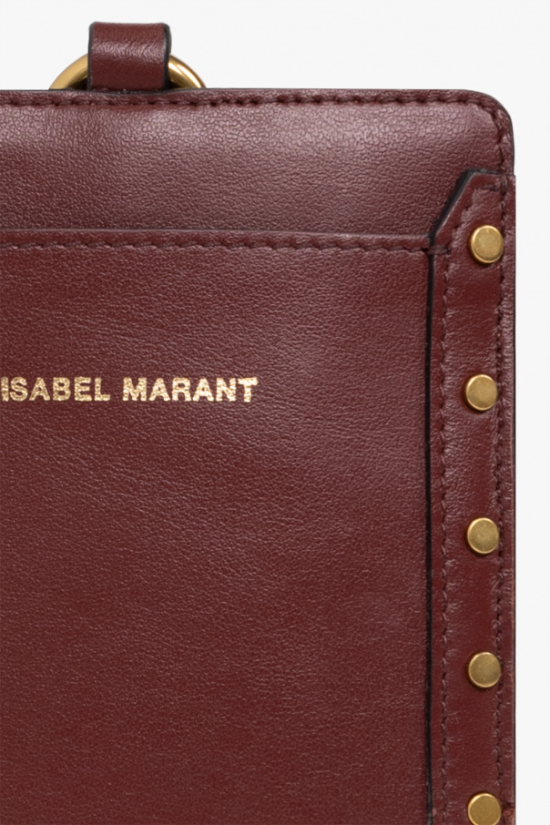 Maroon ‘Tieli’ phone pouch with strap from Isabel Marant. Made of calf leather, this design features a gold-tone logo print, studs, card holder at the back, detachable and adjustable shoulder strap, one internal compartment and antique gold-tone metal hardware.