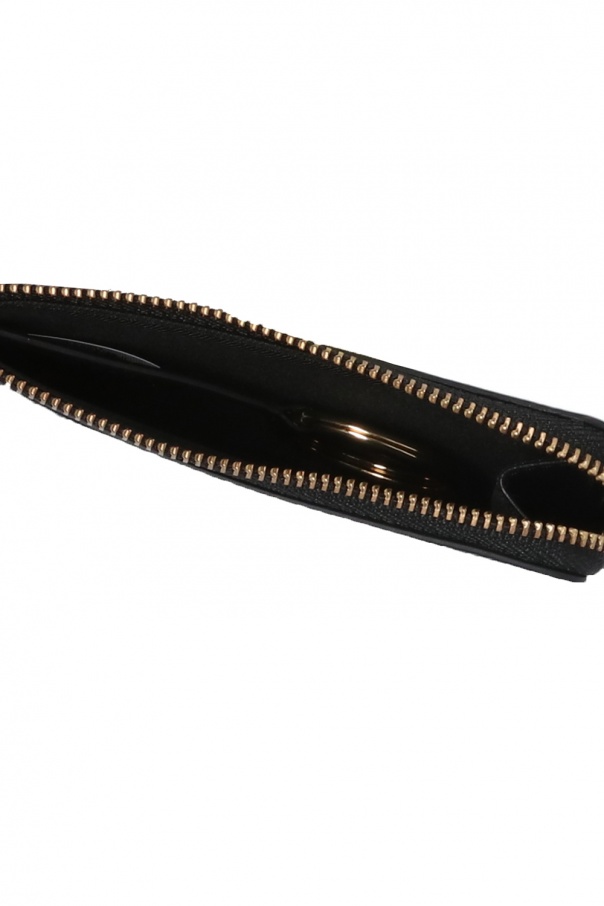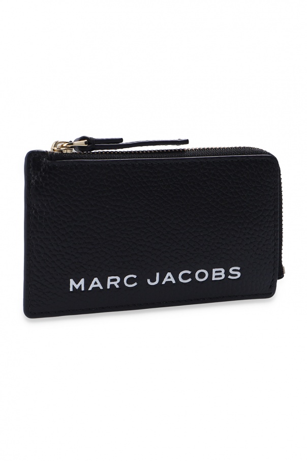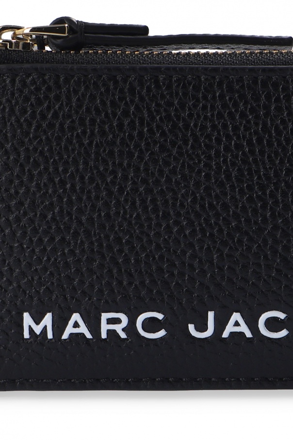 Black key holder from Marc Jacobs (The). Embossed with the brand's logo in white, this leather-crafted item fastens via a zip and employs four card slots on the back, a gold-tone metal hardware and interior with one compartment and a key strap.