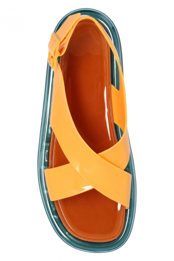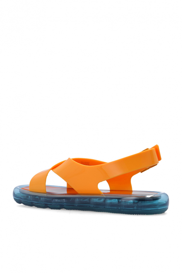 Light orange ‘Bubble Jelly’ rubber sandals from Tory Burch. Sitting on a blue rubber sole with a transparent finish, this model features wide crisscross straps with logo buckles.