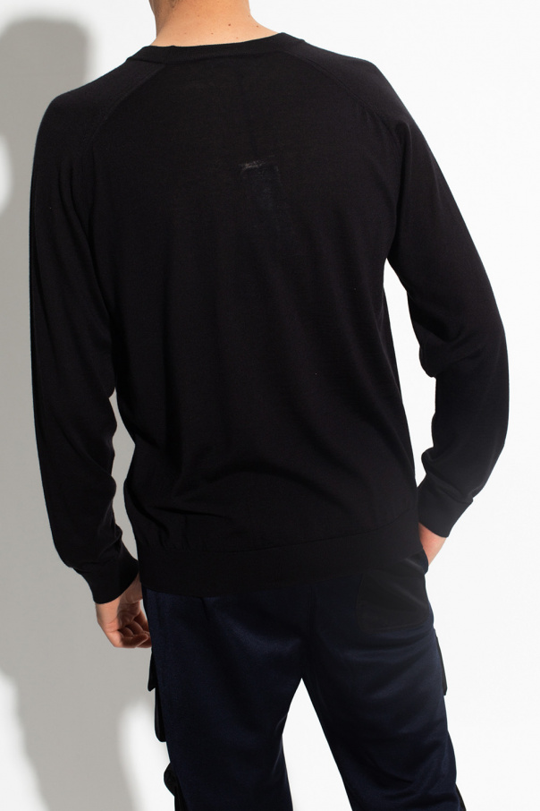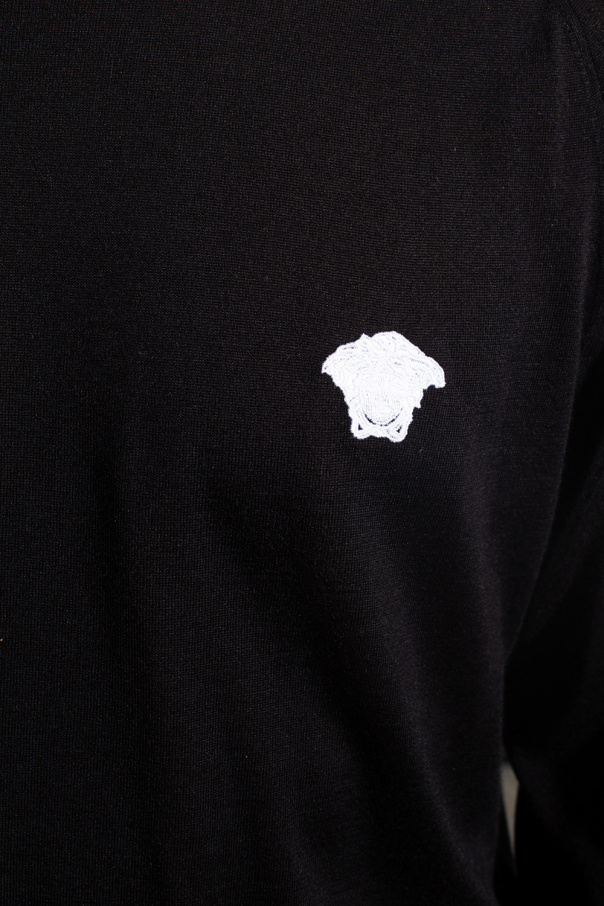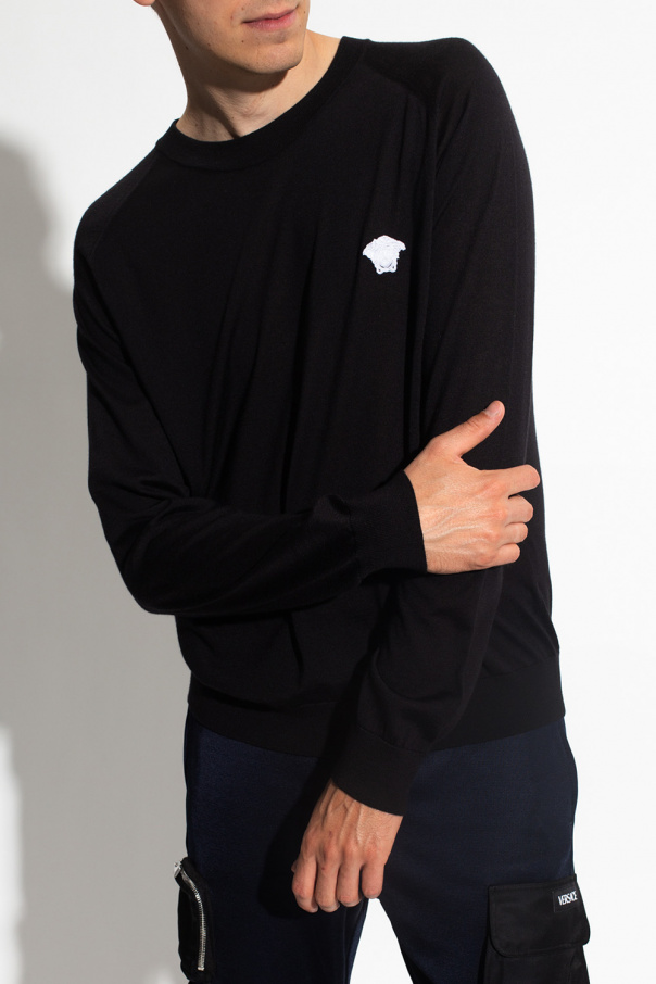 Black crewneck sweater from Versace. Crafted from a wool, cashmere and silk blend, this jumper showcases the brand's signature Medusa head embroidered in white on the front.