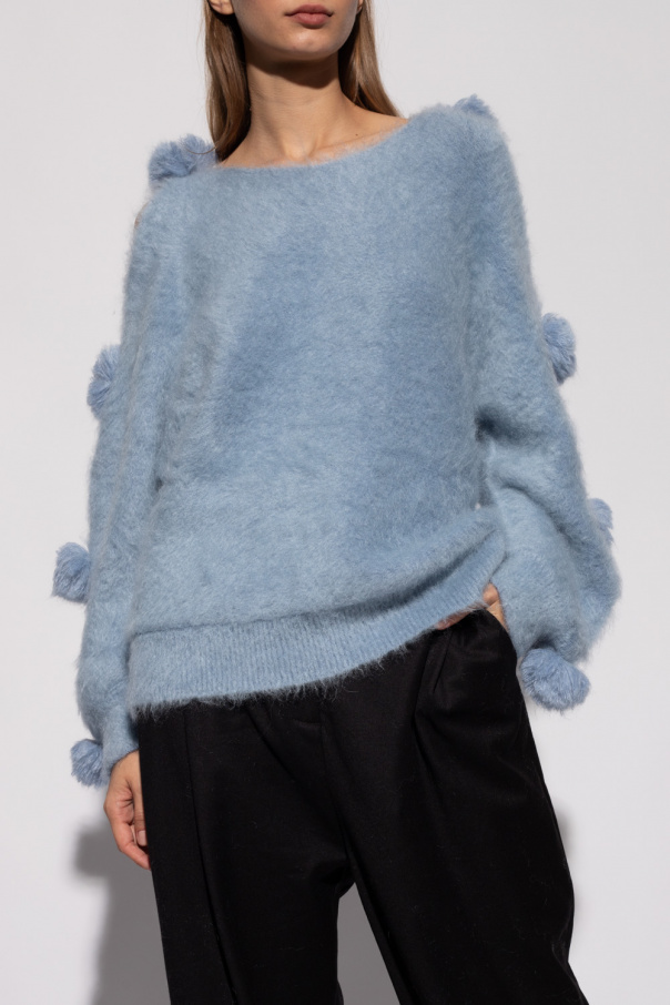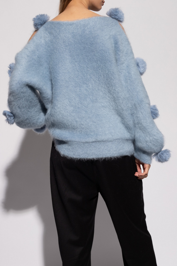Blue sweater from Dsquared2. This garment is enriched by decorative pom-poms, cut-outs and a ribbed hem.