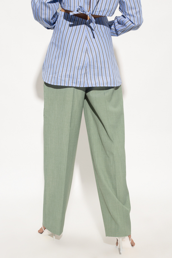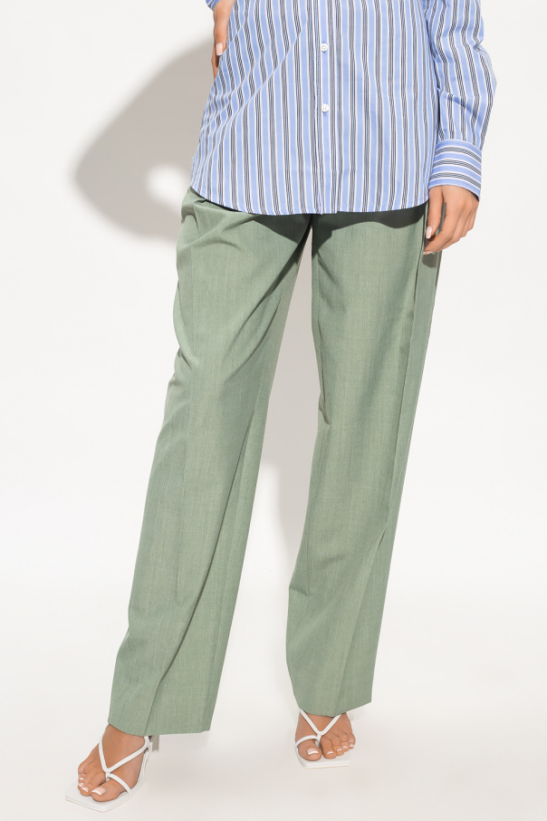 Green pleat-front trousers from Victoria Beckham. Fastened with a zip, hook and button, this pair falls down with straight loose-fitting legs and has decorative pleats, two front pockets and one back pocket.