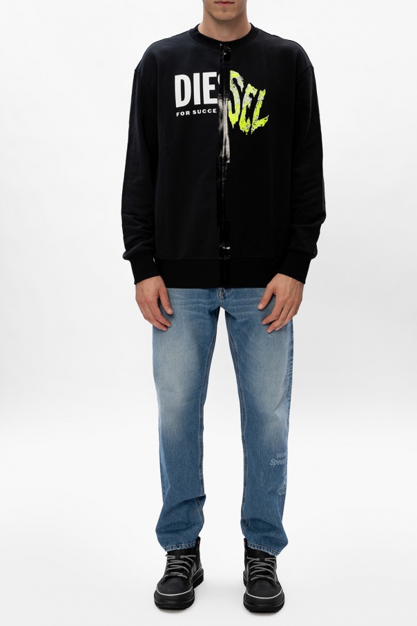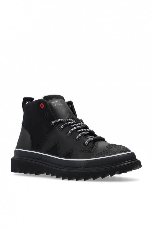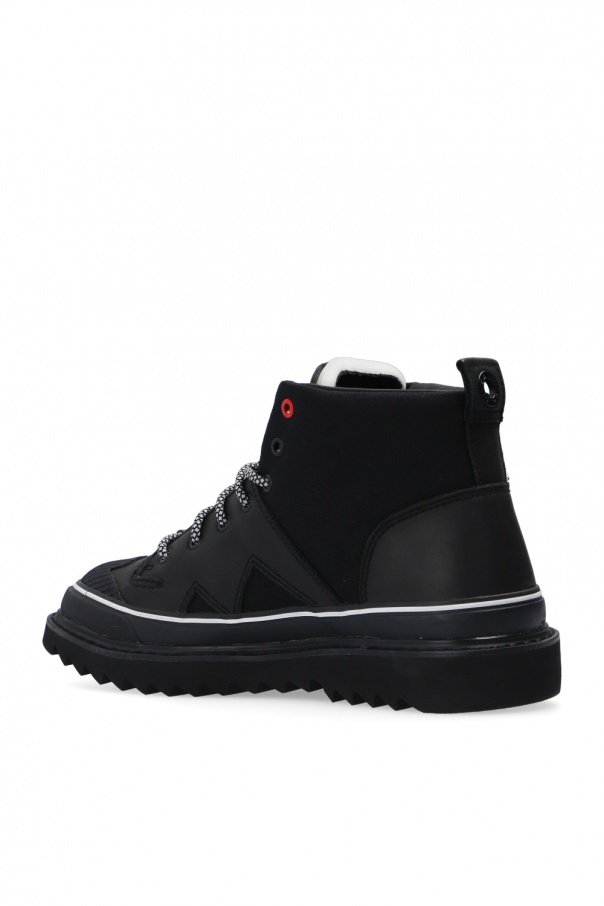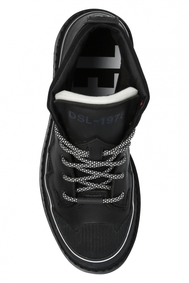 Black ‘H-Shiroki’ ankle boots from Diesel. Featuring a logo print on the tongue and cow leather trims, this lace-up pair is set on a tonal black rubber sole.