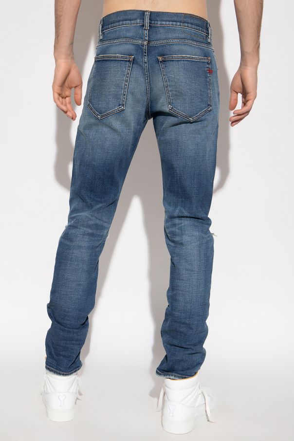 Blue ‘2019 D-Strukt’ slim-fit jeans from Diesel. Accentuated with a stonewashed treatment, this pair falls with tapered legs and features a zip fly with a button, classic five pockets, a patch on the front and red logo embroidery at the back.