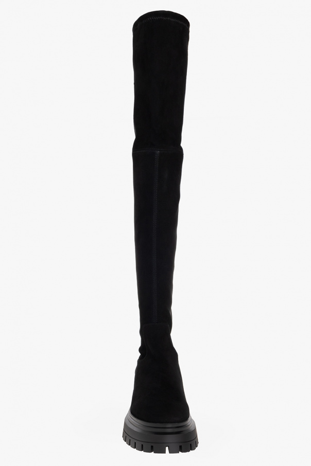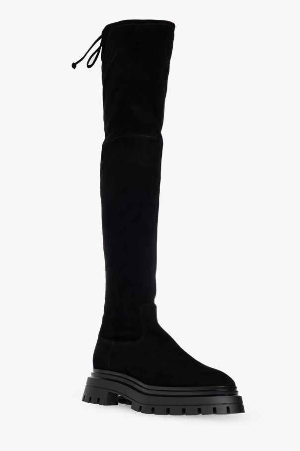 Black ‘Bedfordland’ suede boots from Stuart Weitzman. Crafted from suede, this model features a slip-on silhouette, a drawstring hem and a black rubber sole.
