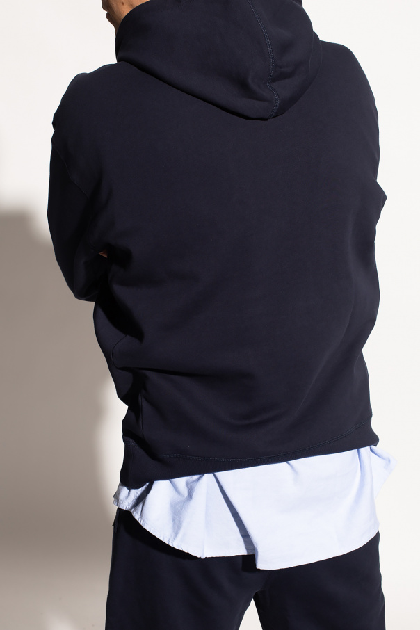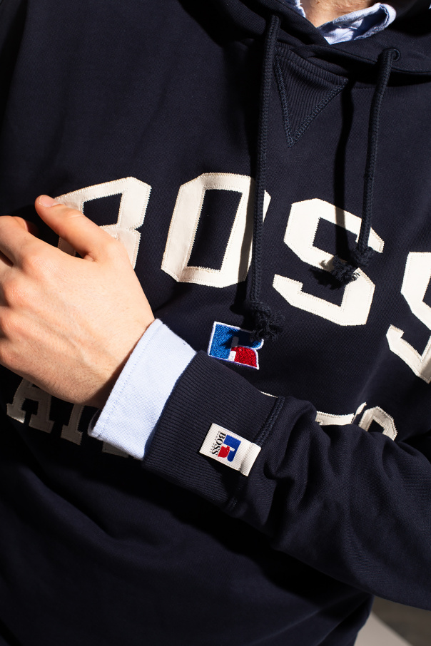 Navy blue sweatshirt with a drawcord-adjustable hood from BOSS x Russell Athletic. Crafted from cotton jersey, this hoodie showcases ribbed trims, a patch and an embroidered logo in cream, blue and red. The collaboration presents bold, off-court classics that combine relaxed fits, sporty details, and a retro-inspired colour palette.