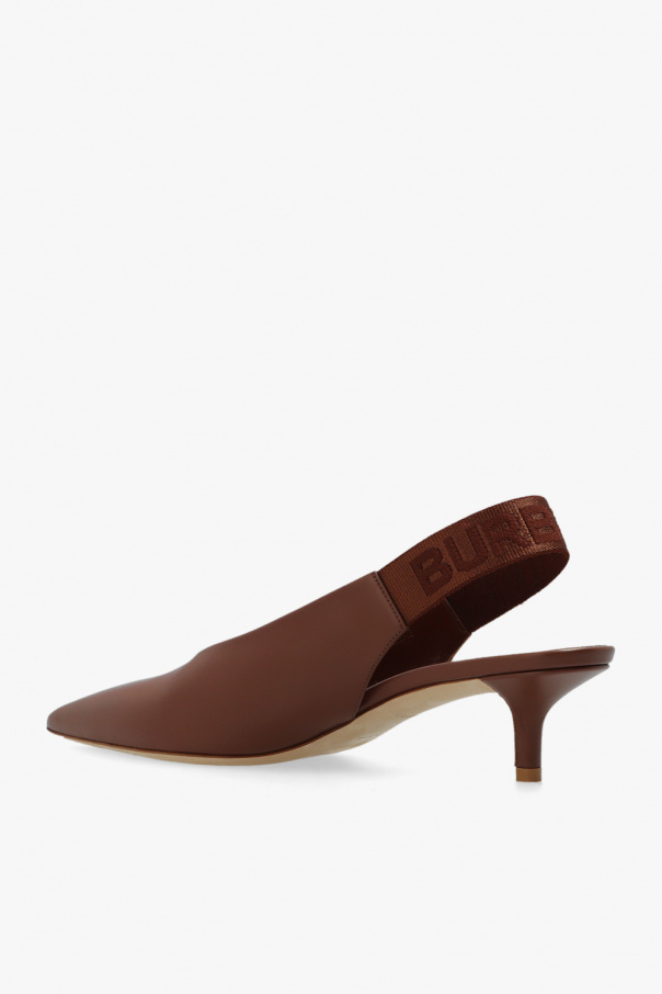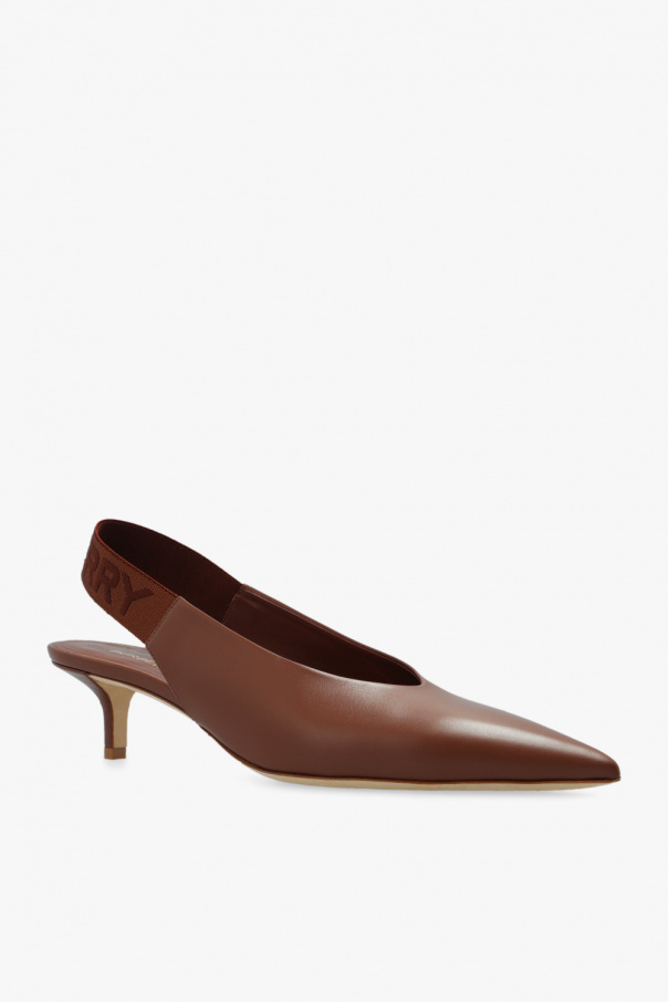 Brown ‘Malinda’ pumps from Burberry. Crafted from leather, this pair is complete with an elastic logo-embossed strap, pointed toe and cream leather sole.