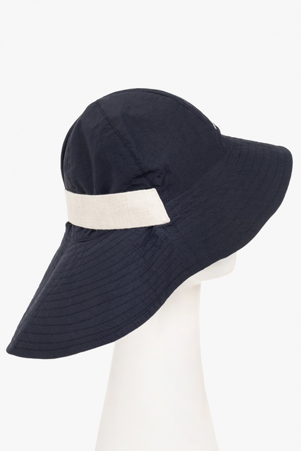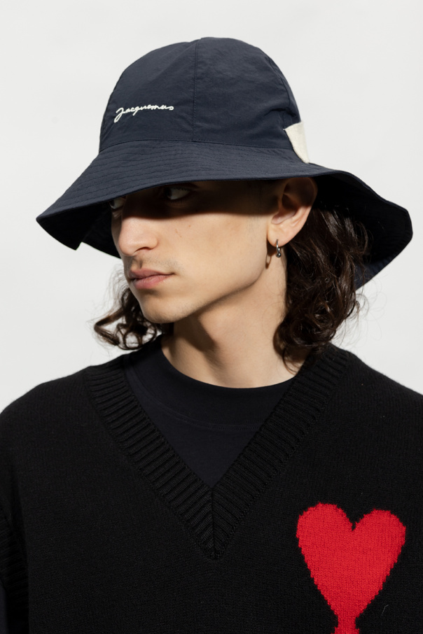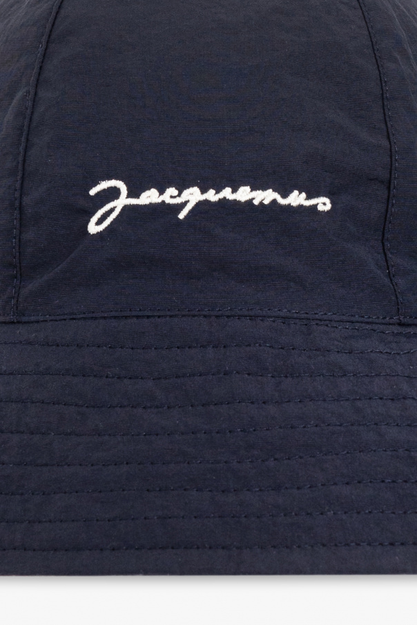 Navy blue ‘Pescadou’ bucket hat from Jacquemus. Embroidered at front with a white logo, this item features a prolonged back hem with a decorative cream strap.