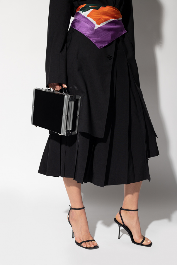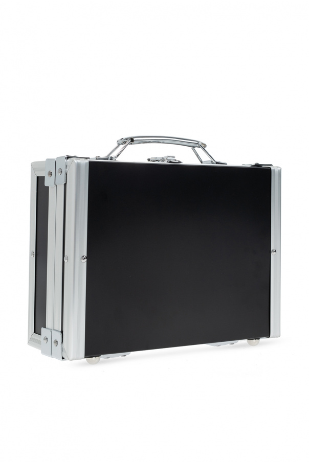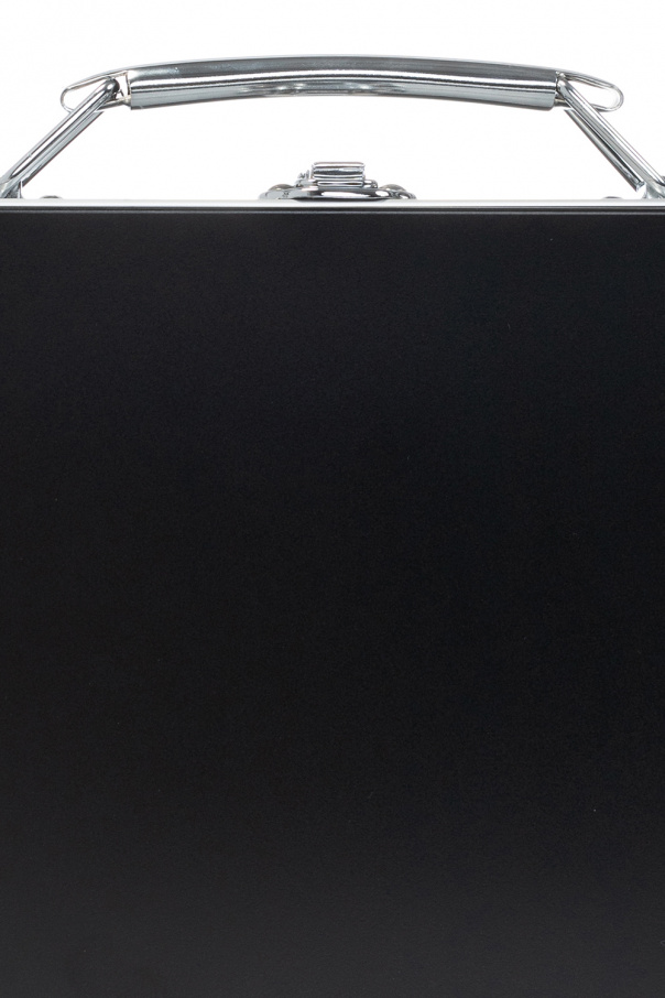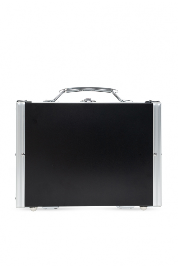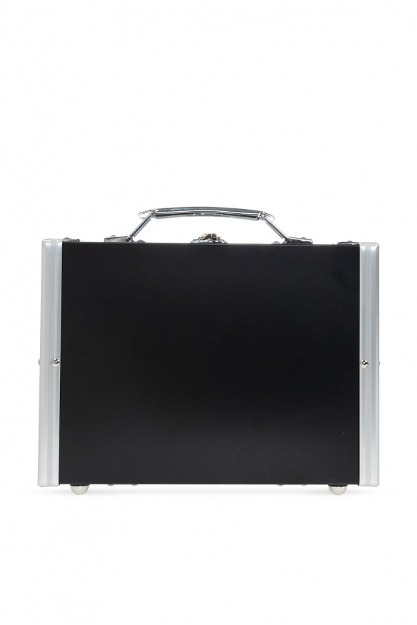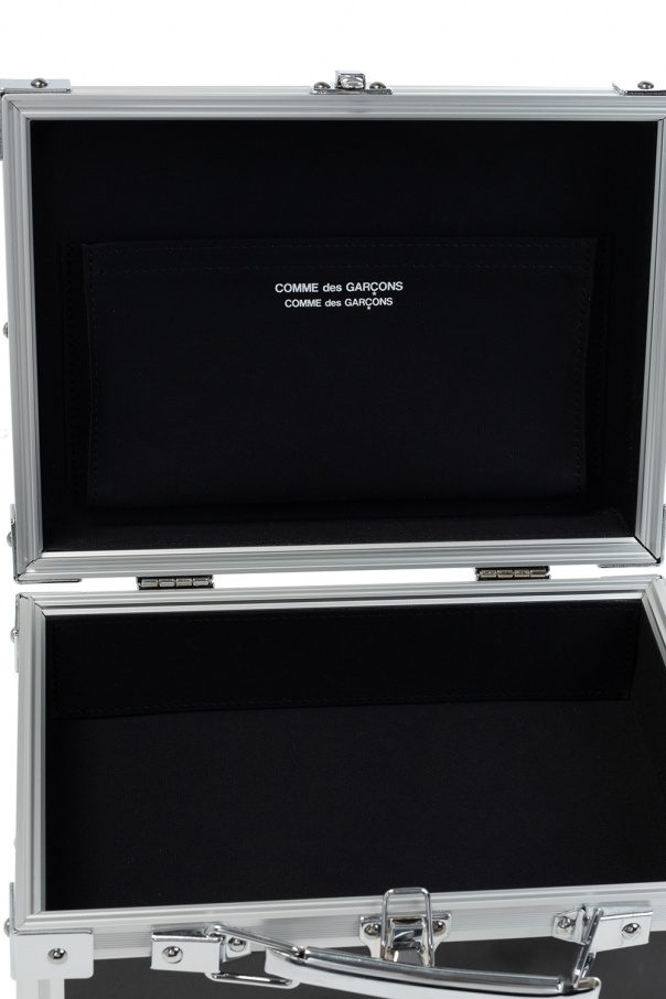Black and silver-tone hand suitcase from CDG By Comme des Garçons. Made of aluminium, this design secures with a decorative fastener and features silver-tone appliqués, a half-round handle and a black cotton-clad interior with one compartment and one slip pocket.