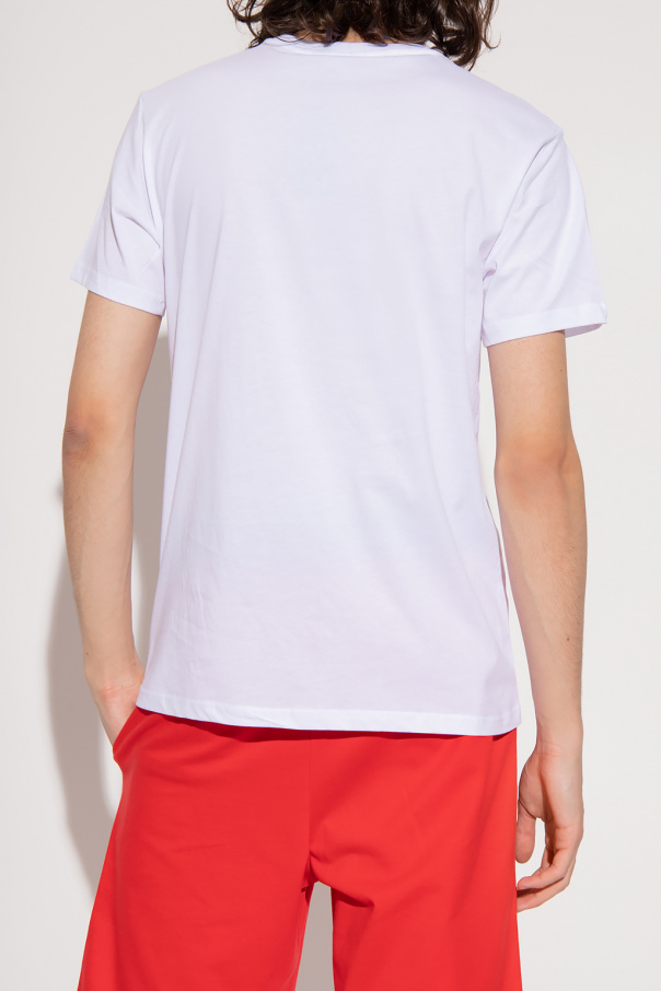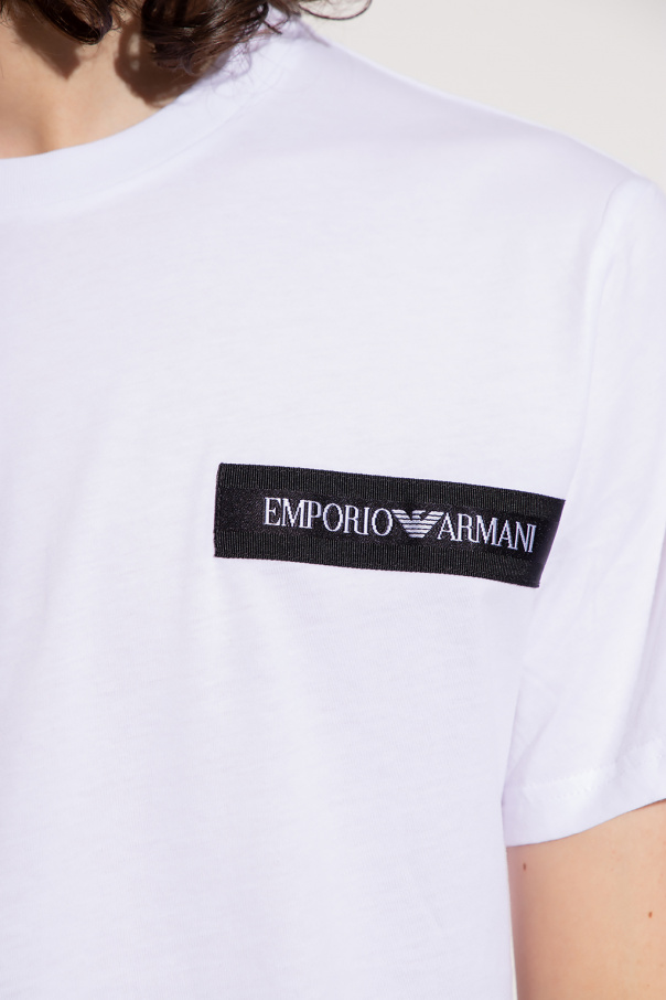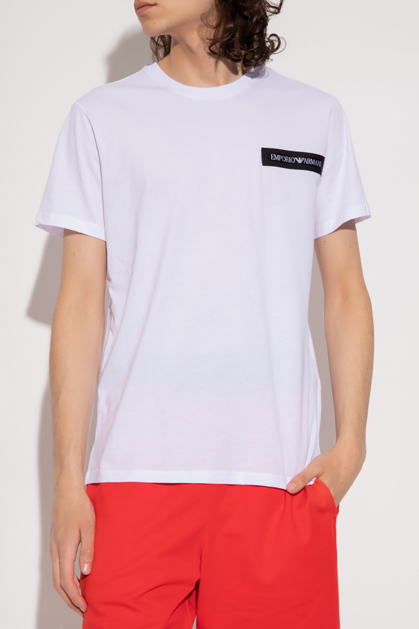 White T-shirt from Emporio Armani, the ‘Swimwear’ collection. Made of cotton, this short sleeve design features a ribbed crew neck and logo patch in black and white.