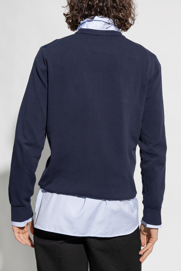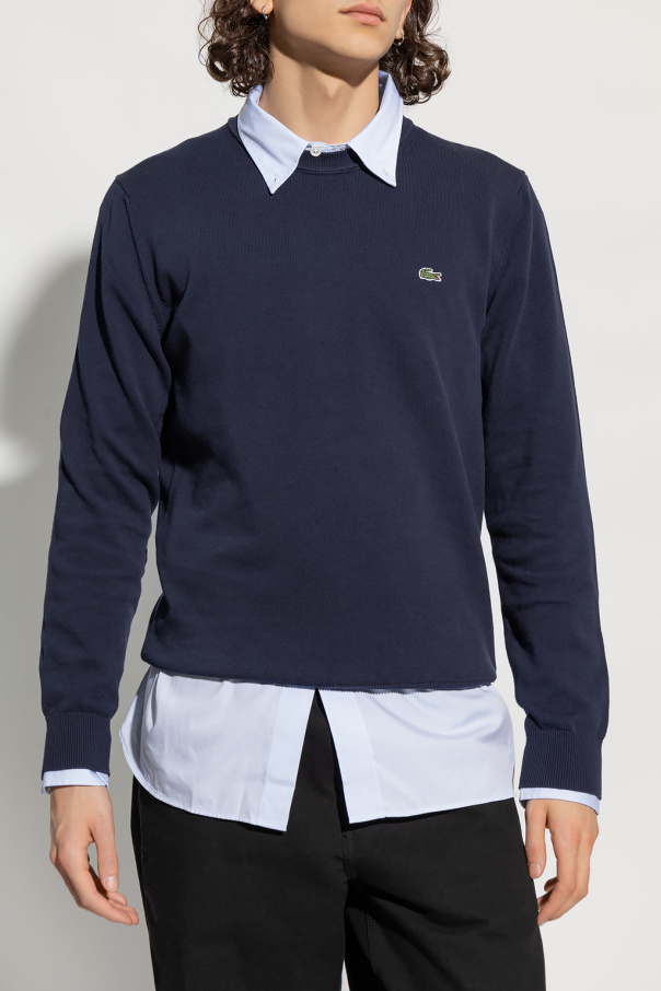 Navy sweater from Lacoste. Made of cotton, this long sleeve design features a green logo patch and ribbed trims at the round neck, hem and cuffs.