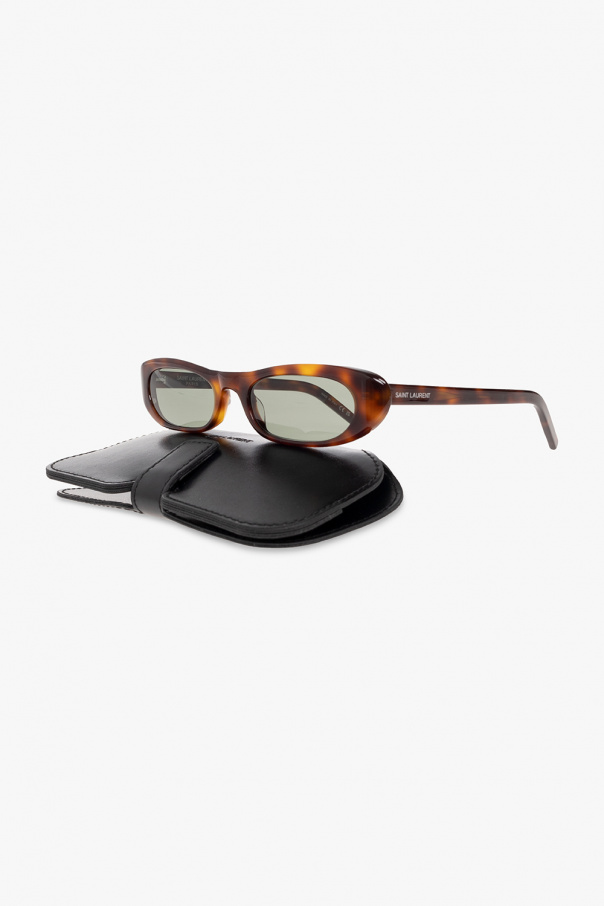 Brown ‘SL 557 SHADE’ tortoiseshell sunglasses from Saint Laurent. Flaunting rectangular cat-eye design, this model features white logo detailing on the temples and green lenses with 100% UVA/UVB protection. Case included.