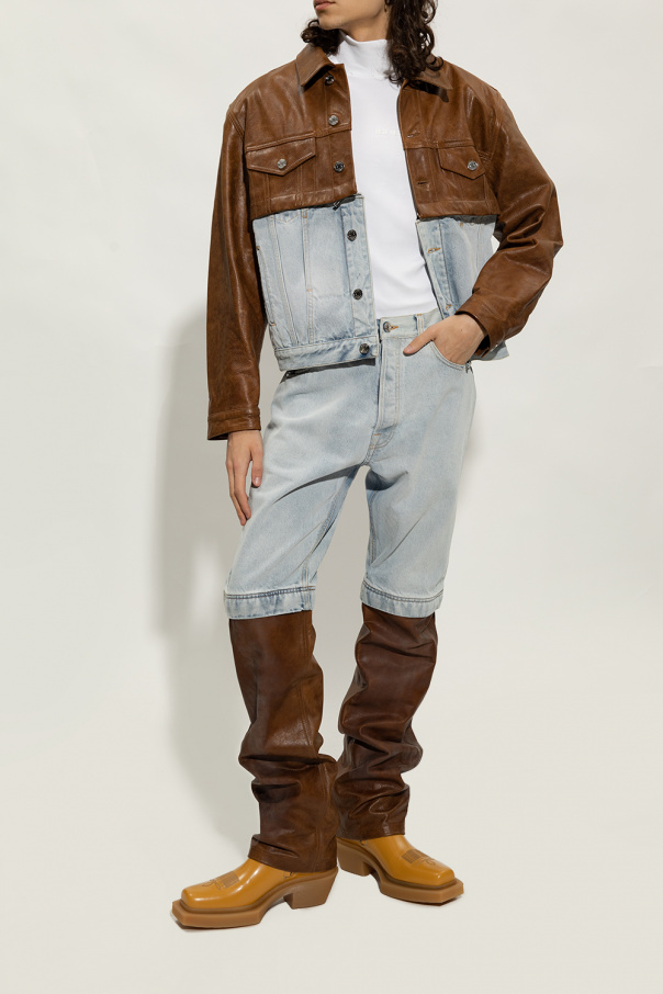 Beige heeled ankle boots from VTMNTS. Crafted from patent leather, this pair features a side zip, decorative stitching, the brand’s signature barcode motif and beige rubber sole.