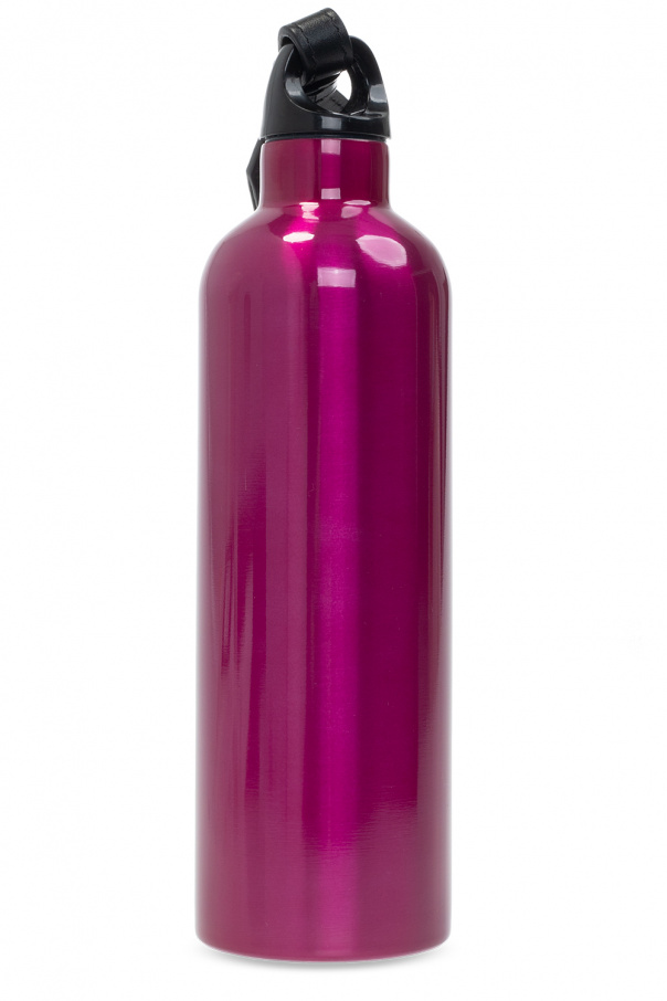 Purple water bottle from Versace. Made from stainless steel, this design features orange logo lettering and a black grosgrain strap embroidered with a Greek pattern.