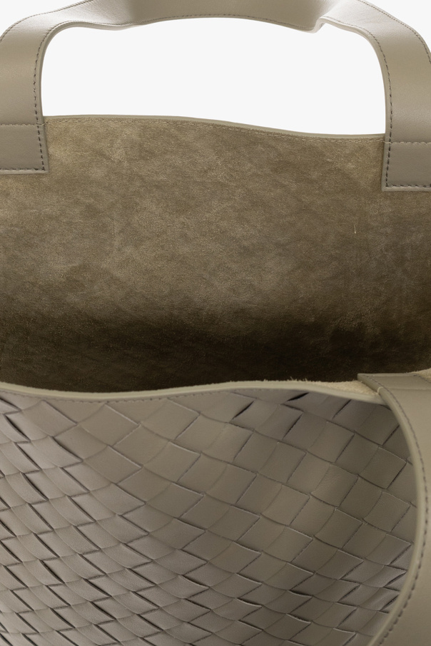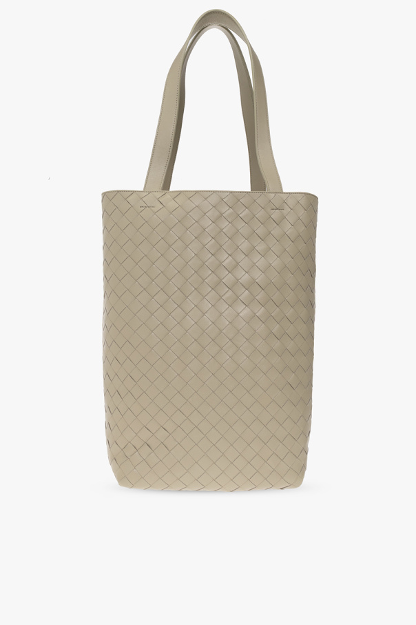 Greenish grey ‘Classic Intrecciato Small’ shopper bag from Bottega Veneta. Made of calf leather with the brand’s signature Intrecciato weave, this model features two half-round handles and one internal compartment.