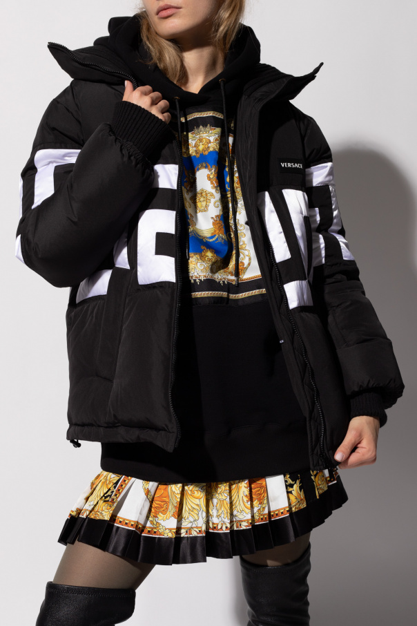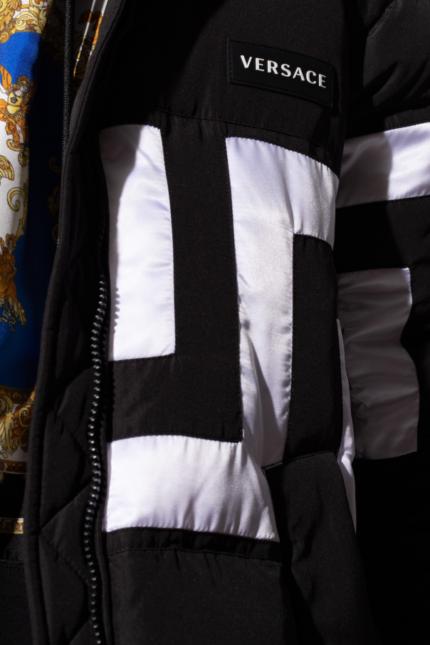 Black down jacket with a stand-up collar from Versace. Fastened with a two-way zip, this design features the label’s signature Greek pattern in white, a logo patch in white and black, two snap-fastened pockets, zipped cuffs and drawstring hem.