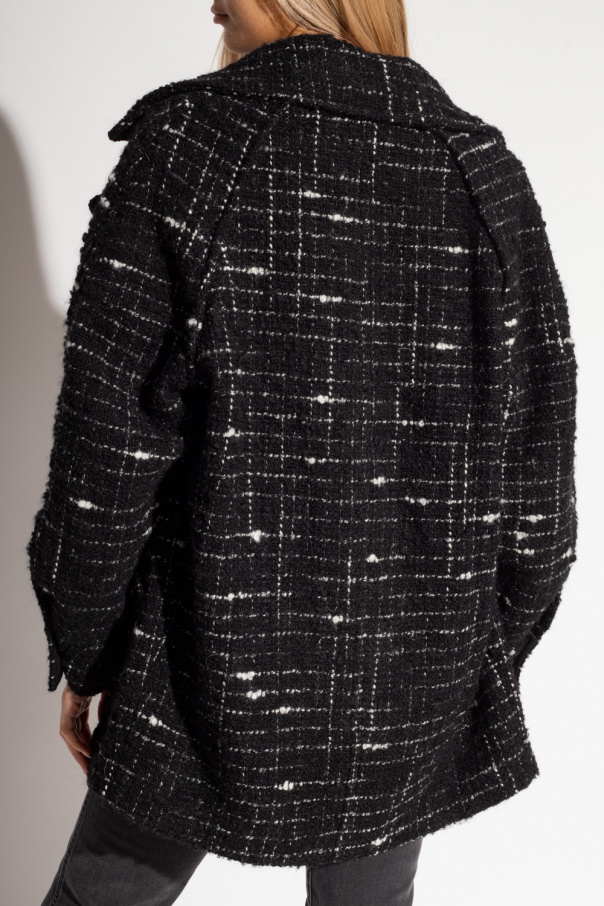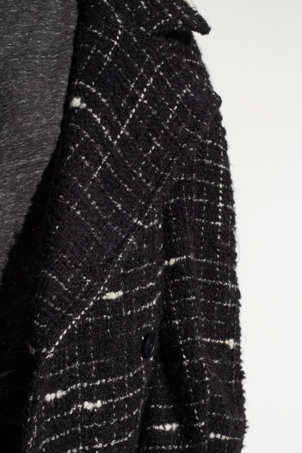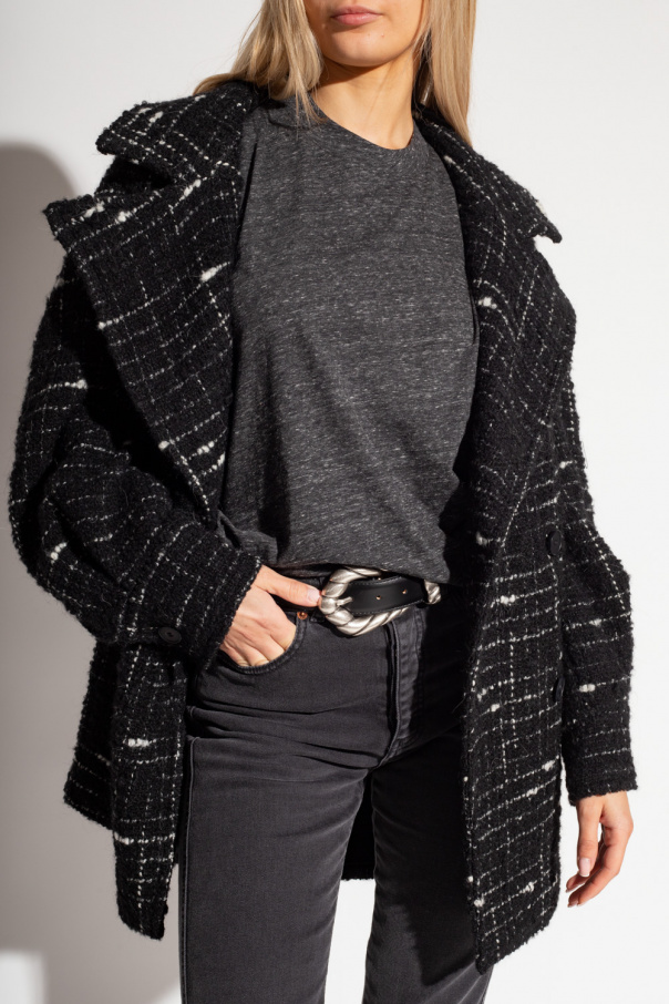 Black and white ‘Derek’ coat from Iro. Cut from tweed, this garment features button fastenings, tie belt, checked pattern, notch lapels, two slip pockets and long sleeves with low shoulders and buttoned cuffs.