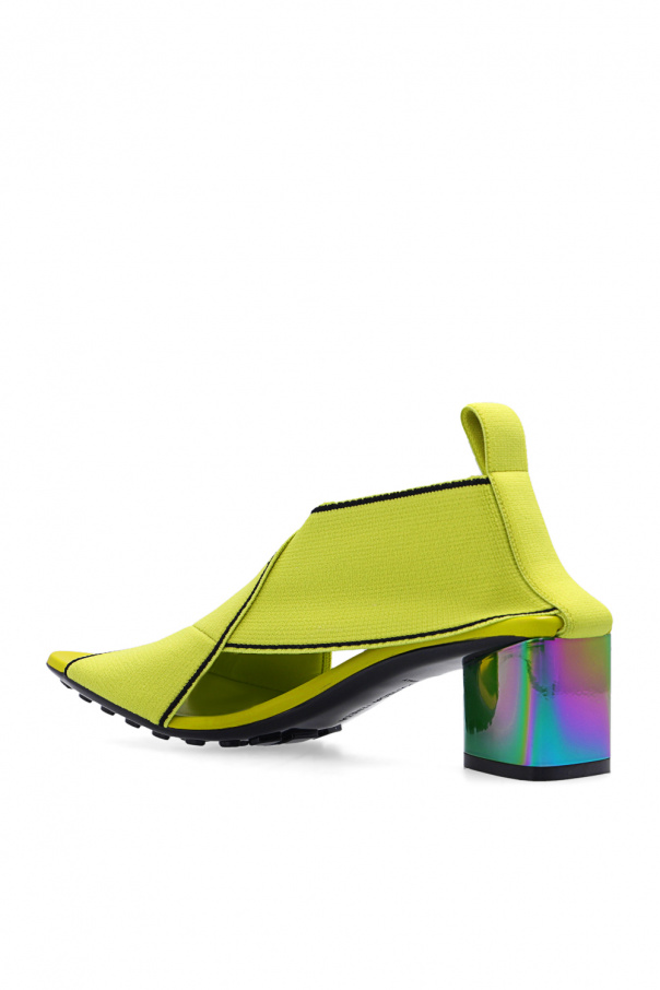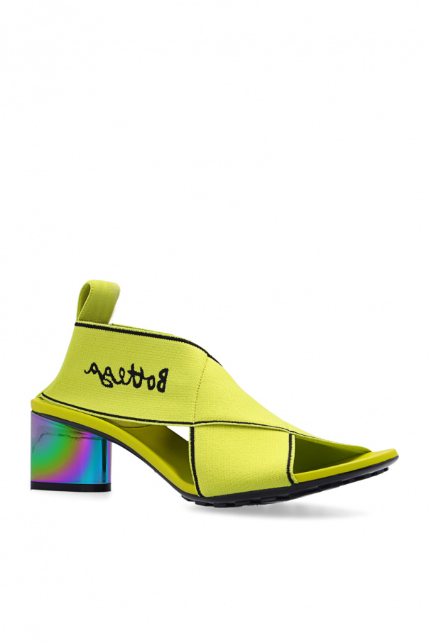 Green and black ‘Flex’ heeled sandals from Bottega Veneta. With crisscross elastic straps on the front, this model features an embroidered logo, a black rubber sole and a multicoloured, iridescent heel.