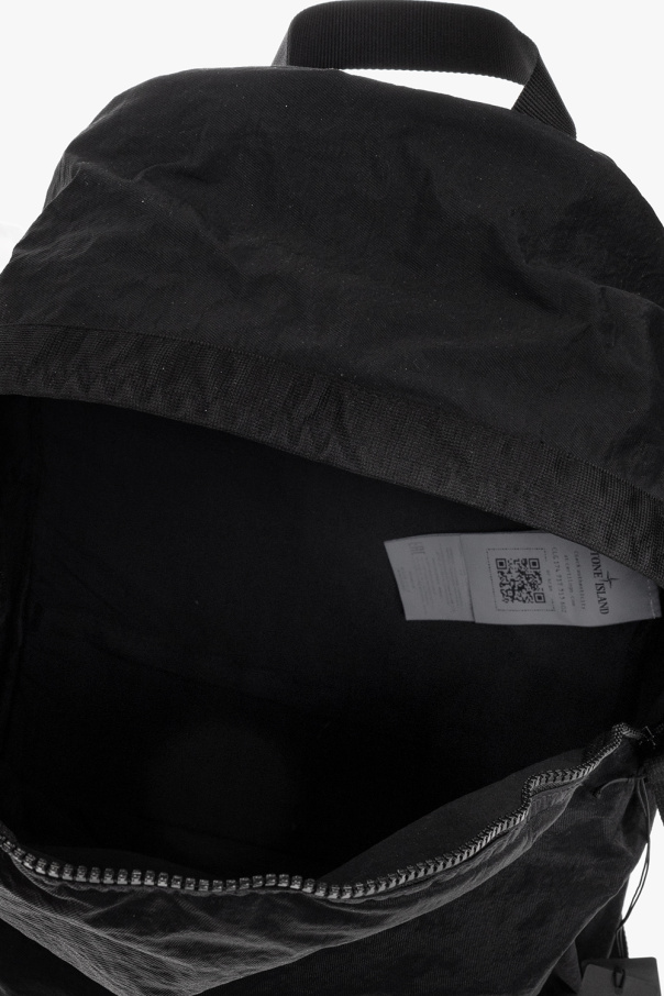 Black backpack from Stone Island Kids. Emblazoned with a logo patch on the front, this design fastens with a zipper and features a zip pocket with snap-fastened flap, half-round handle, adjustable shoulder straps, black metal hardware and one internal compartment.
