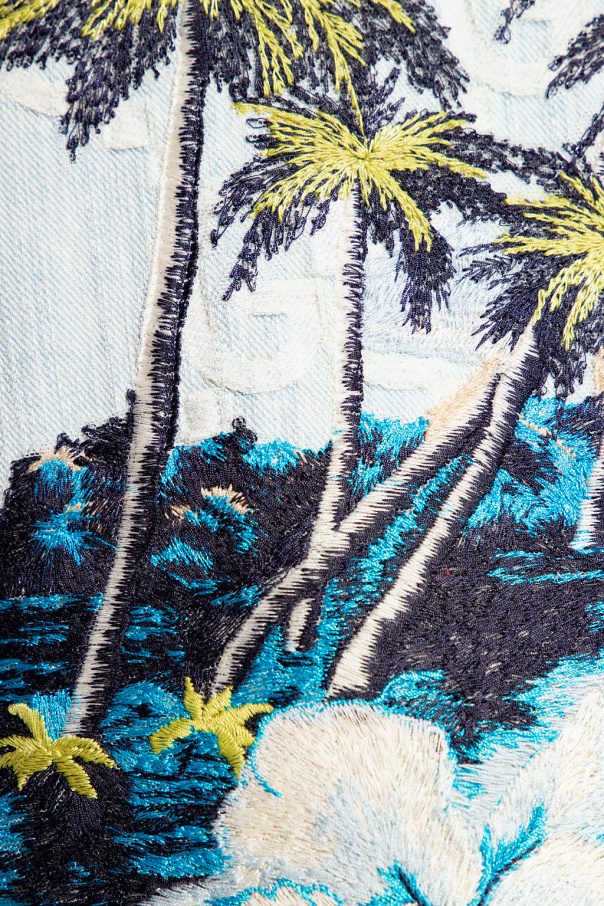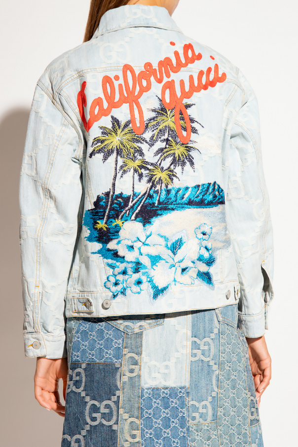 Light blue denim jacket from Gucci. Embellished with a ‘GG’ pattern, this style features a relaxed silhouette with button fastenings, two slip pockets, two flapped button pockets, long sleeves with button cuffs and colourful ‘California Gucci’ embroidery at the back.